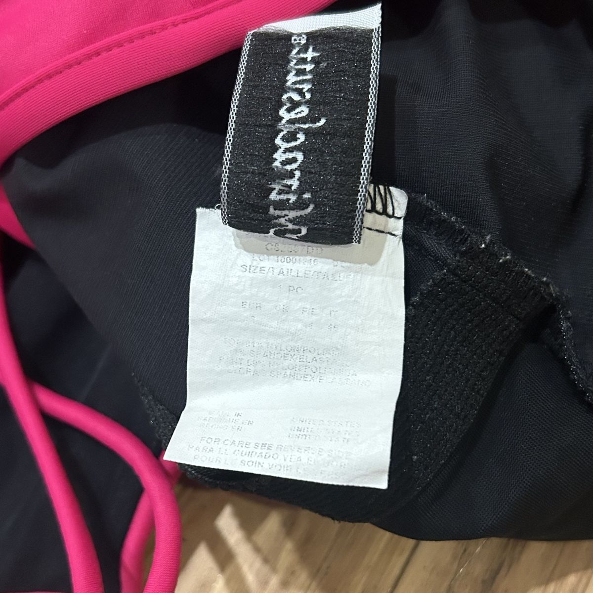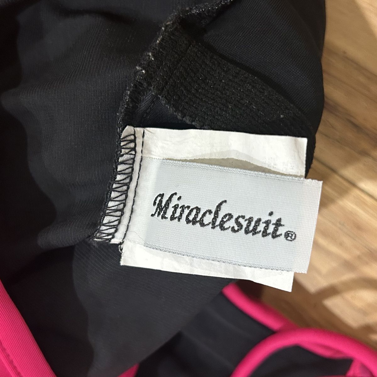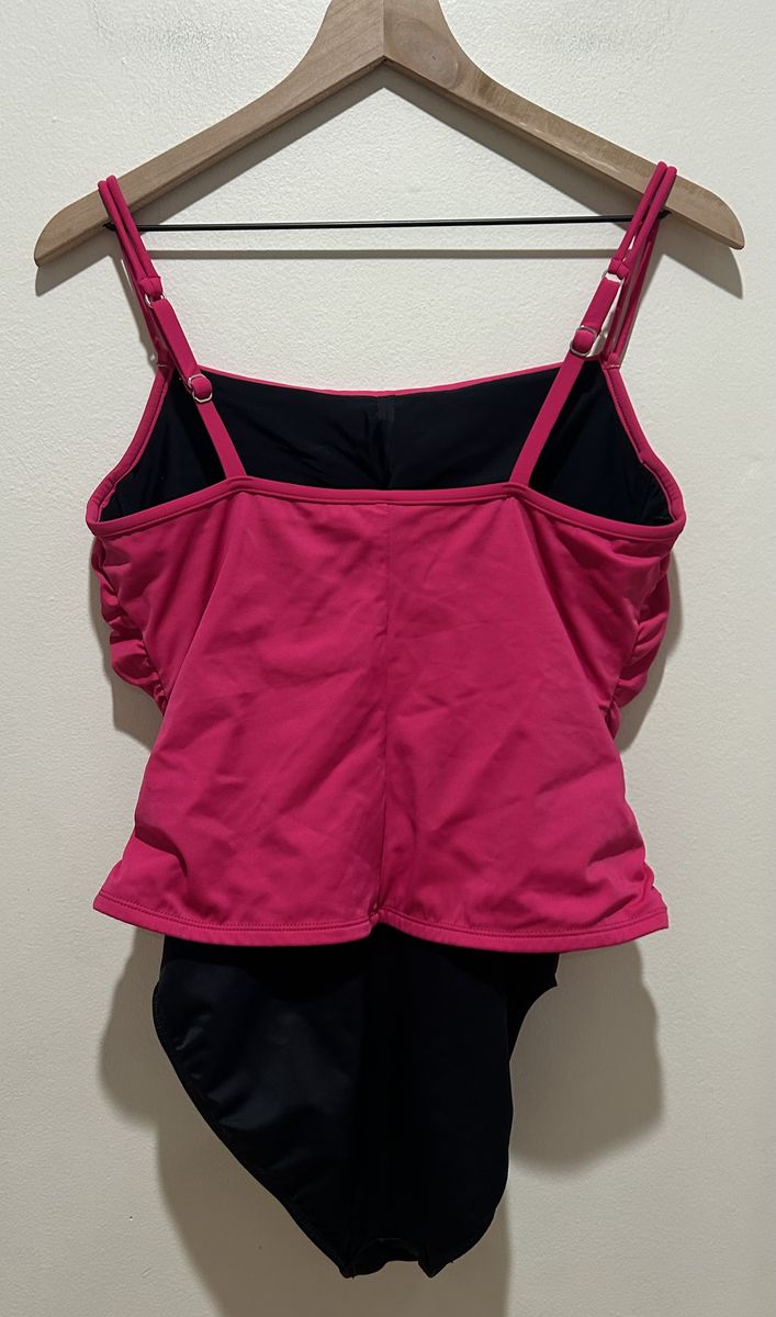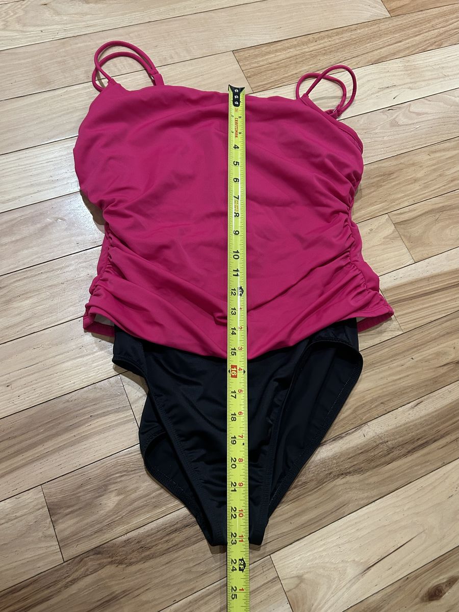 Miraclesuit Sofaux Tankini Bright Pink and Black Color Block One Piece Swimsuit - Women’s Size 10 (please note that the size tag is worn so size is estimated off measurements) - with underwire, non padded cups, clean liner and adjustable straps for flexible fit - ruched highlights give a slimming look - good condition (main sign of use is worn inner tag) - pre-owned.