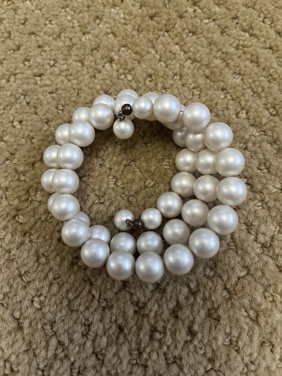VenmoBuy vintage, you get better quality for less money. This has the wonderful memory wire wrap around the pearls. It has a dangling bead at each end for extra detail. It is a triple strand look. It is an off white color. It's just a fun bracelet. Selling to help a parent.