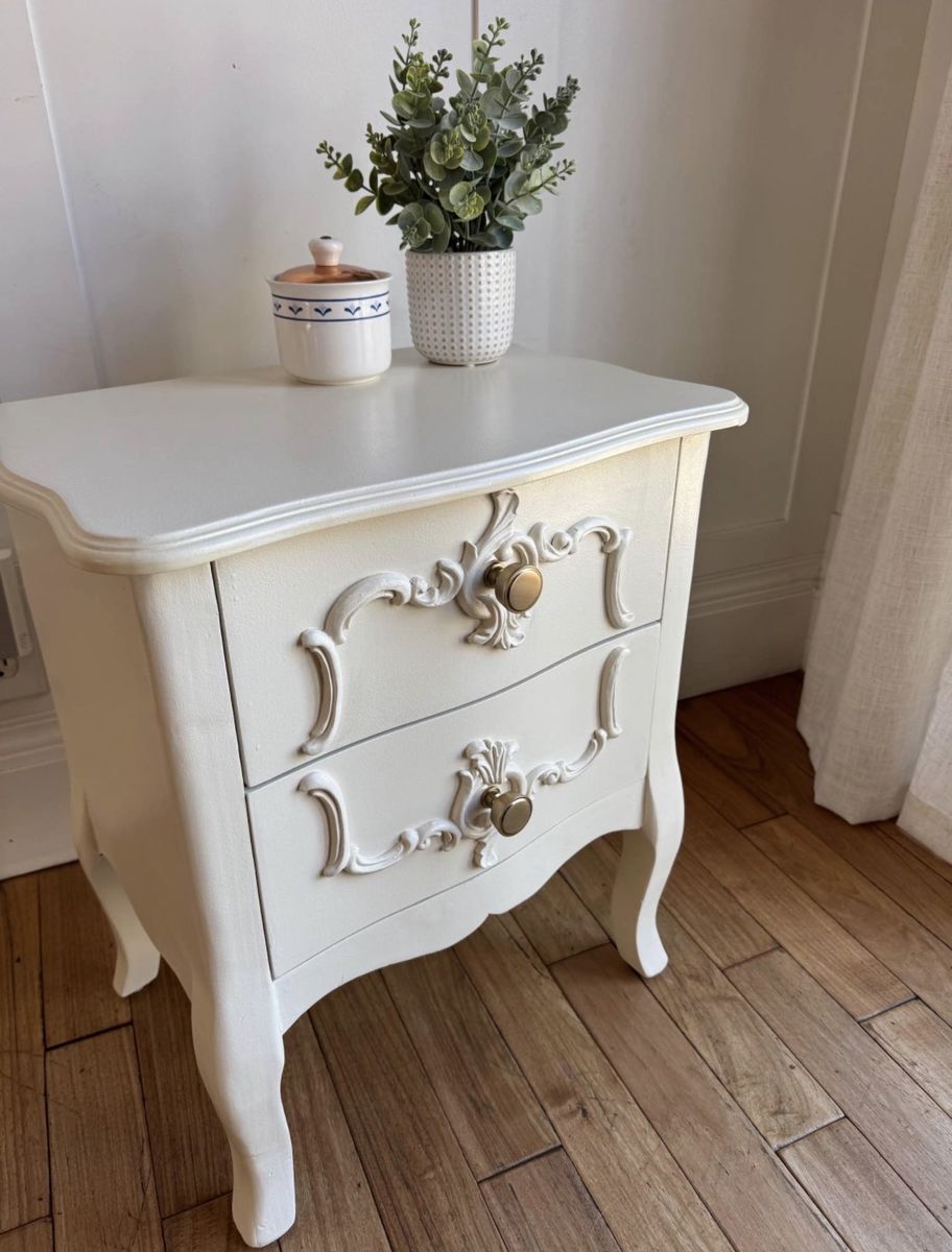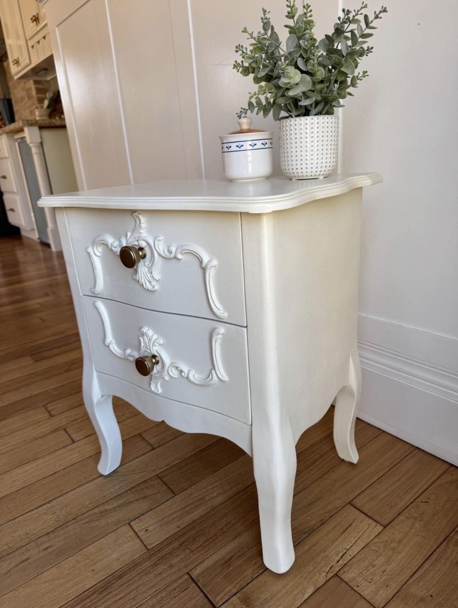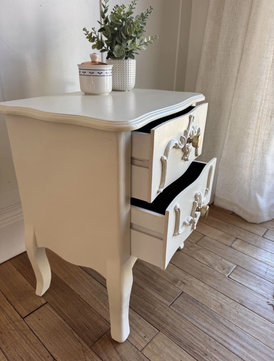 Recently refinished in antique white with new hardware. Works great as a nightstand, small accent table, or even a kid’s bedside table.