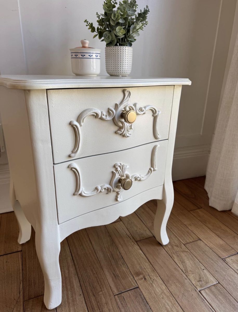 VenmoCharming French country style nightstand with curved legs and decorative drawer details.