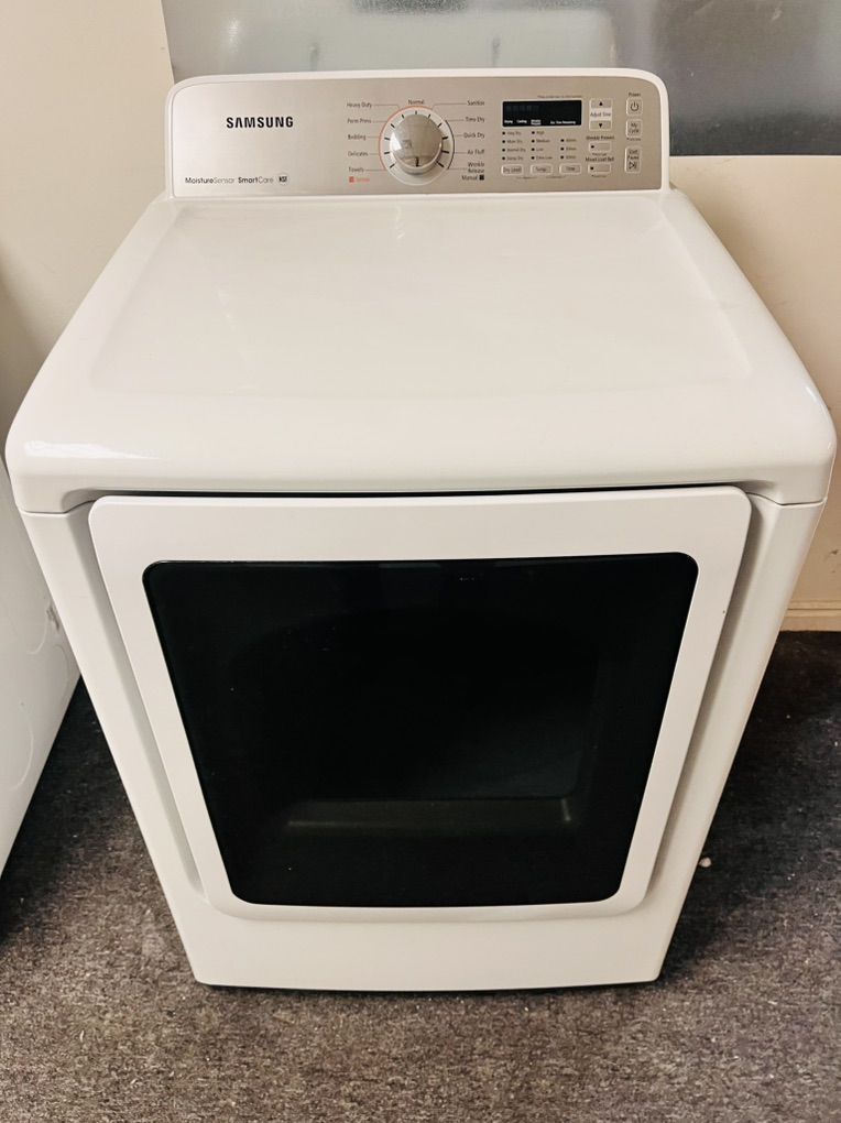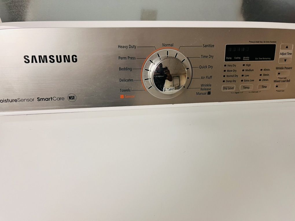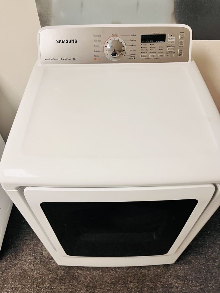 Samsung electric dryer in excellent condition and very clean it’s 7.4 cu ft capacity with automatic moisture sensor cycles, it has brand new roller wheels and comes with a 45 day warranty. Only $180 I can deliver and install for a little extra call 8015403075