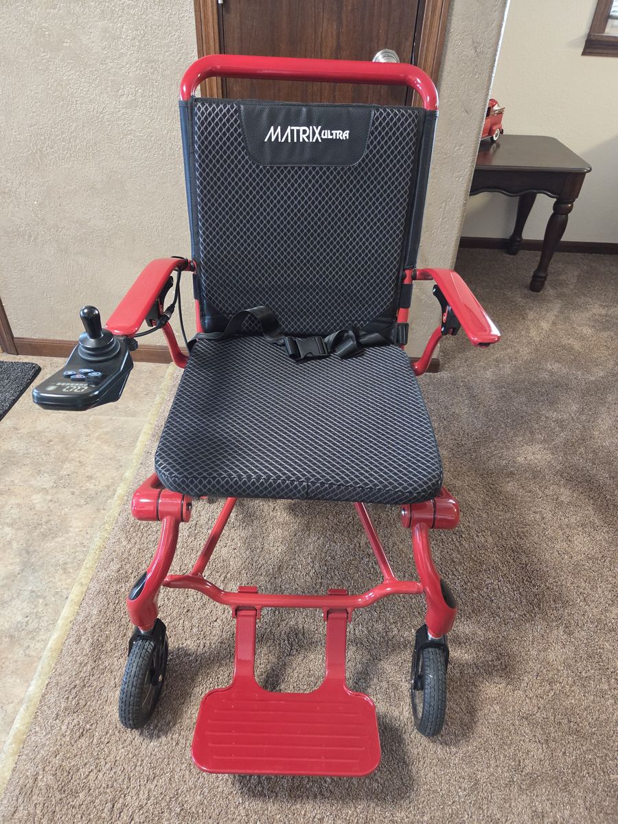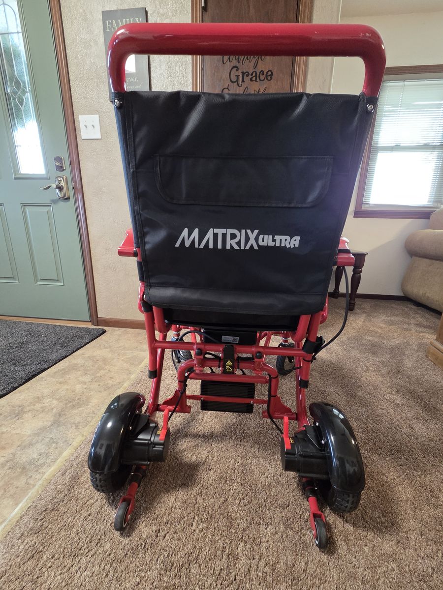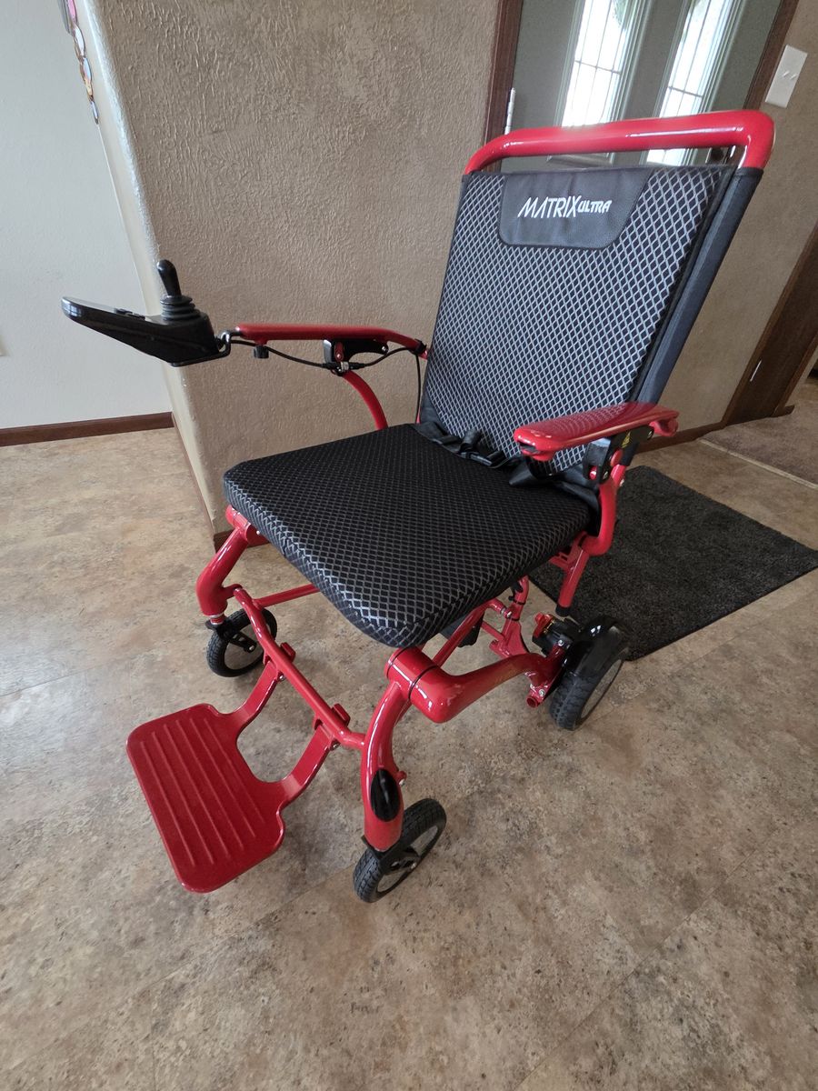 This is a fantastic well built and designed wheelchair. Easy to operate, lightweight enough to pick up to put in a car trunk. Durable and will keep working for years. My daughter used this for 1 semester of college. My mom has the same wheelchair and its held up to heavy use with no issues. Mom tried similar less expensive chairs after giving ours a try and after several returns, bought the same chair. It's the best in its class on the market. It's lightweight, folds easily like a stroller and operates easily indoors and out. Comes with all the original accessories. Looks and runs like new other than a few white scuff marks on the frame. Search Matrix Ultra Wheelchair for more details on-line.