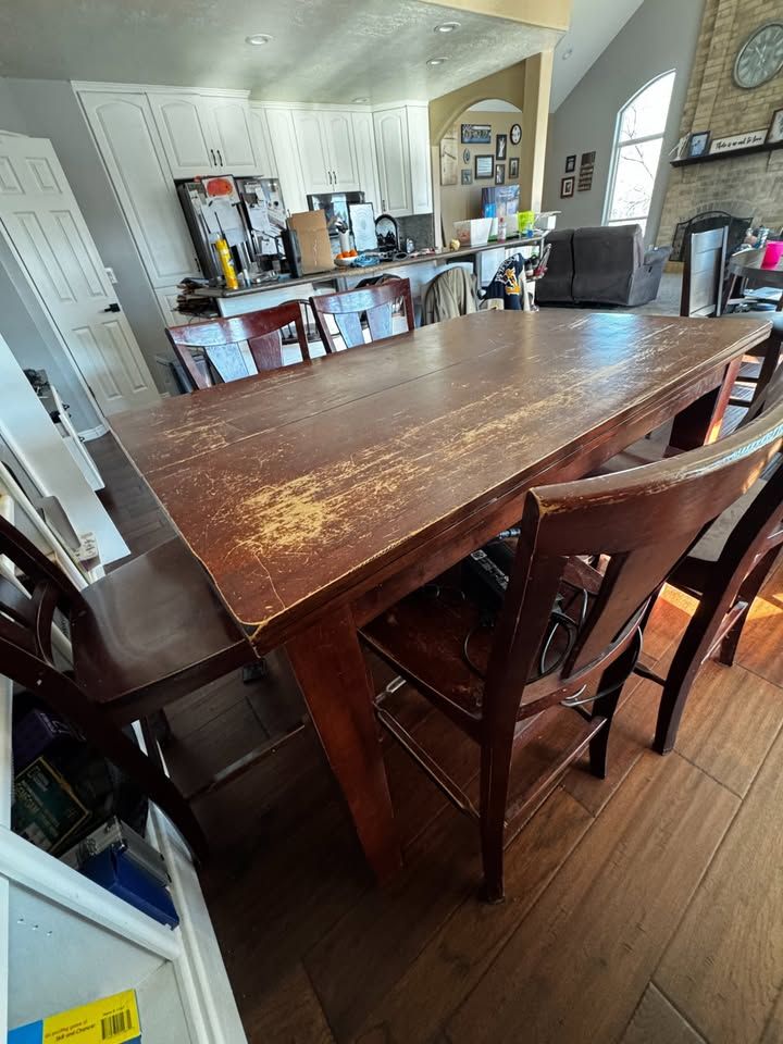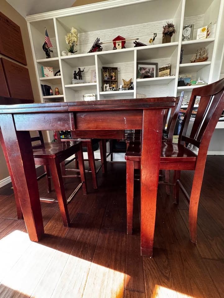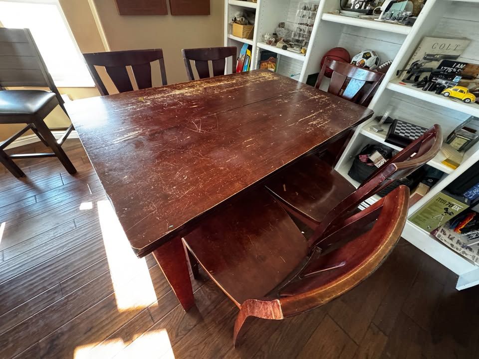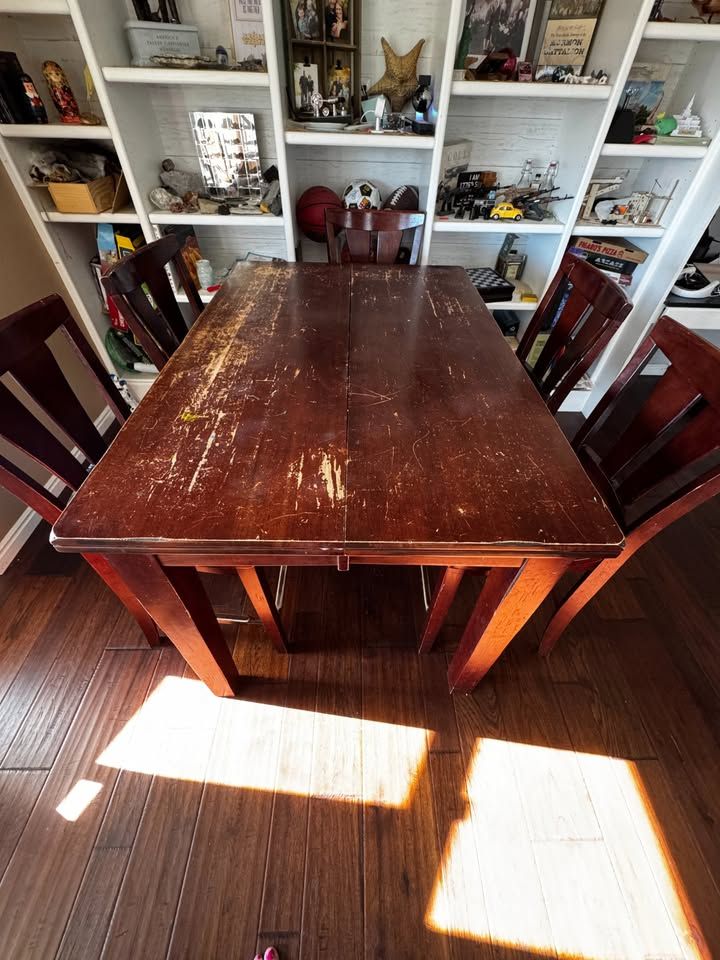 ApplePaySolid wood bar-height dining table with 6 chairs. Built-in leaf expands the table to a square. Some surface wear and a couple chair footrests are broken, so priced accordingly. Pickup only.