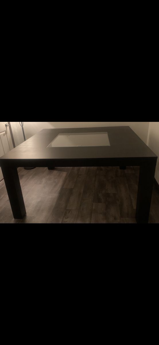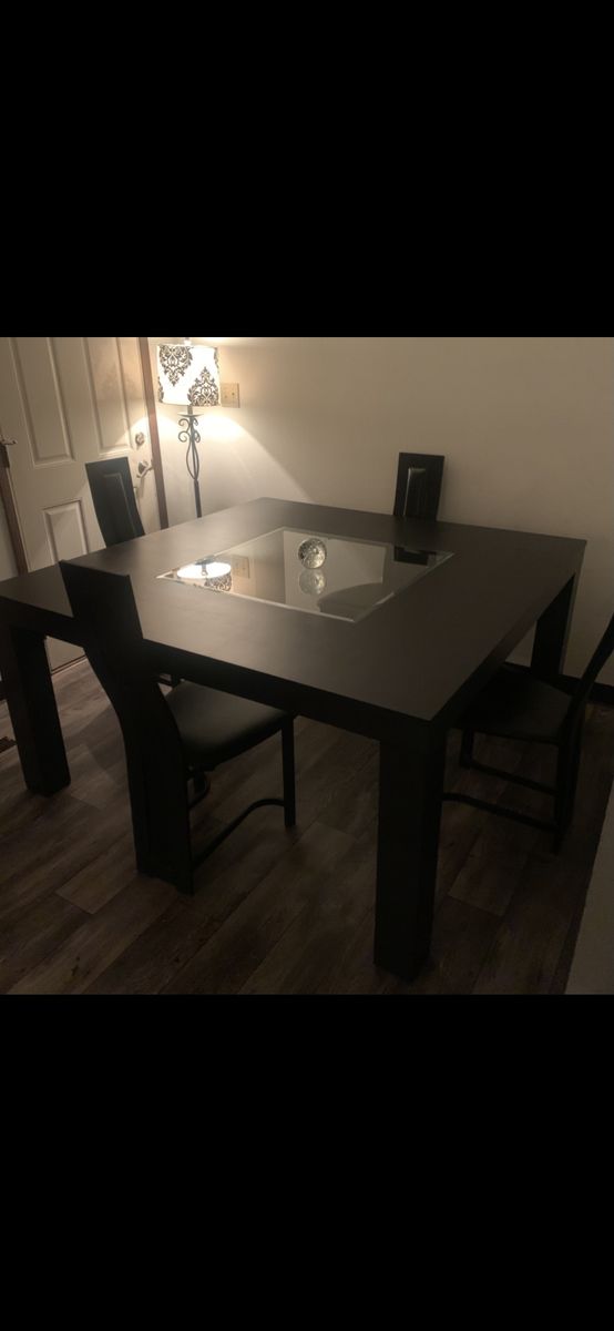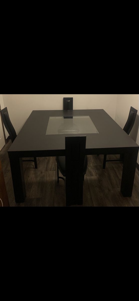 VenmoThis is a unique gorgeous black dining table. Absolutely stunning. It came from an estate sale in California. Very high end. If you want something classy and stylish that nobody else has this is the table for you. Modern retro 5ft squared dining table featuring a 5mm thick beveled glass insert, and durable corner-block construction. Crafted with hardwood solids, utilizing corner block construction and tongue and groove joints for stability. Serious inquiries only Measurements: Table 5ft squared 27in height Can deliver There are also 8 chairs that can go with the table I have another ad with those if interested