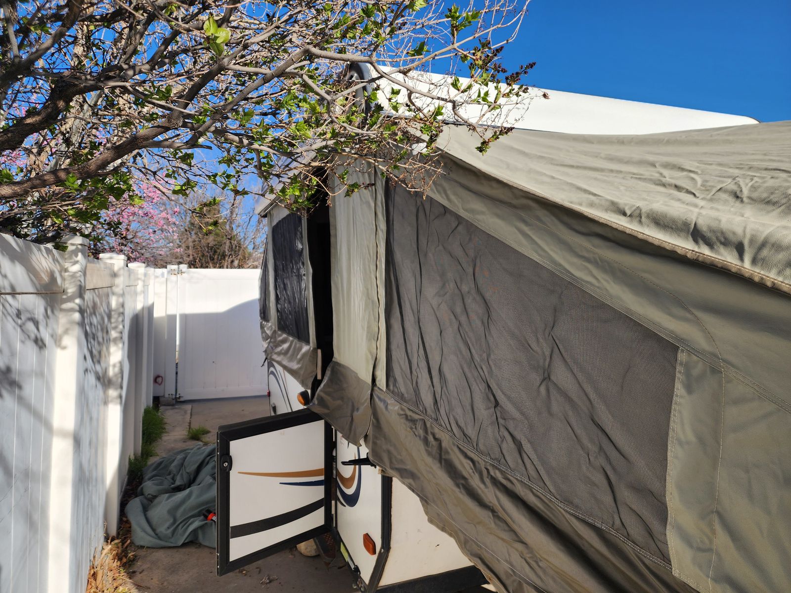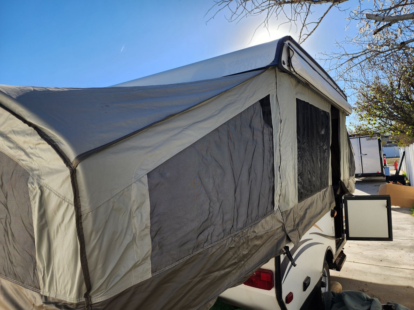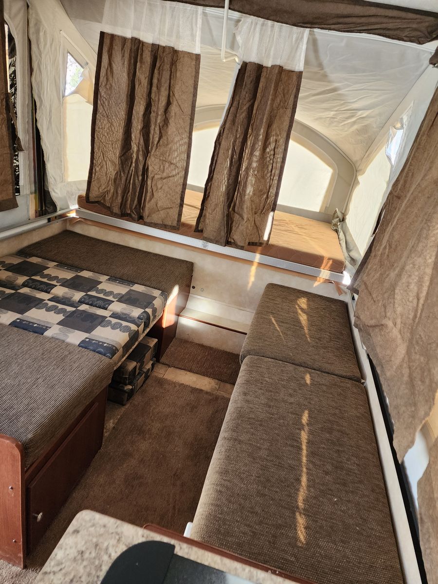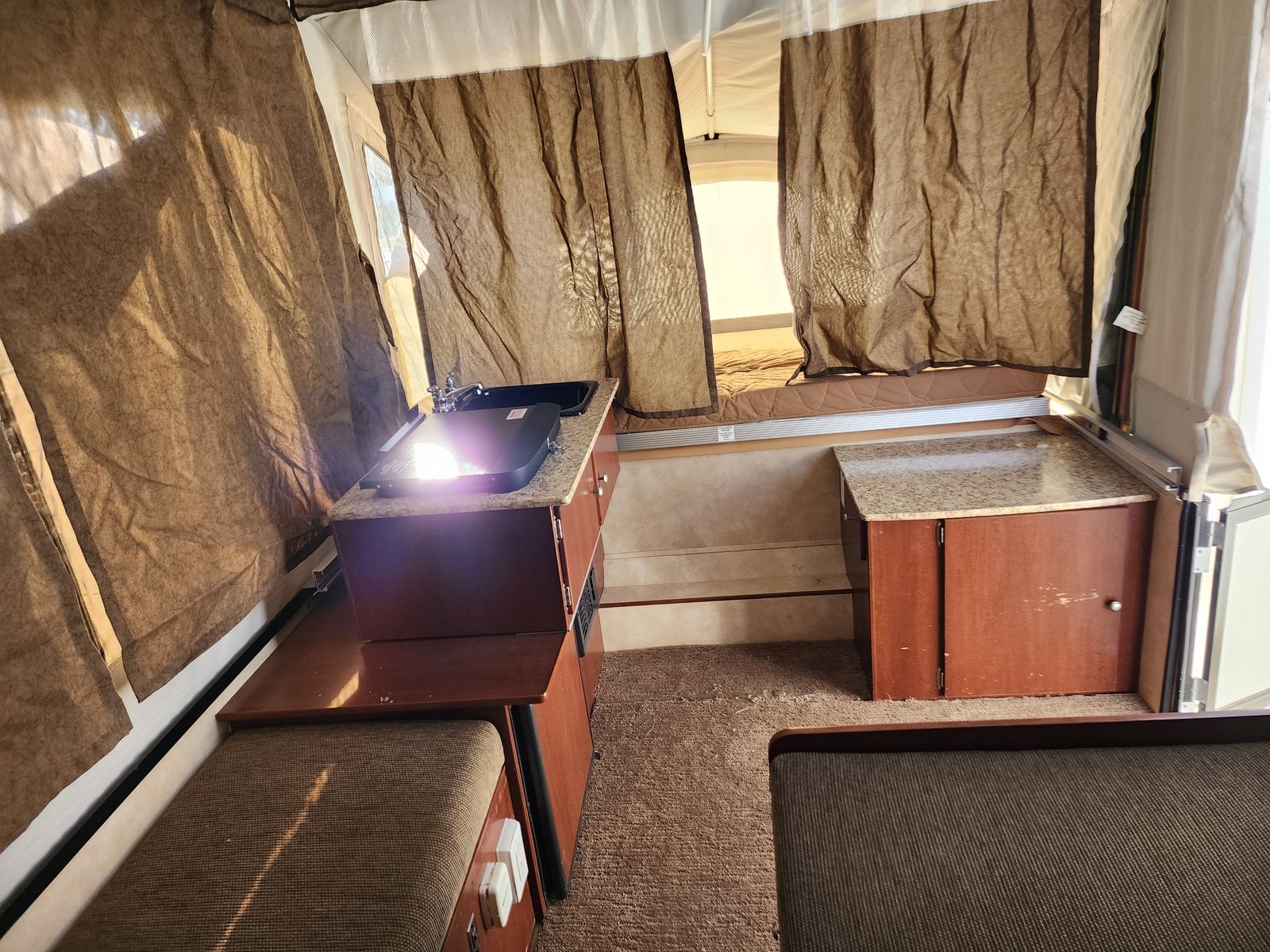 No rips or tears in the canvas, all systems working, no issues. Propane stove and wash sink inside. Working furnace and LP refridgerator.