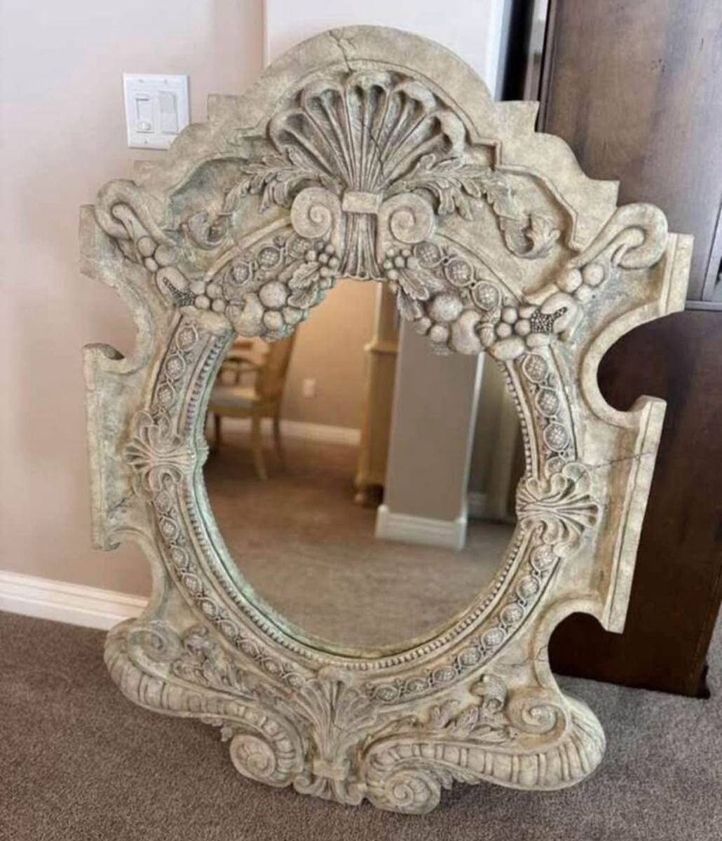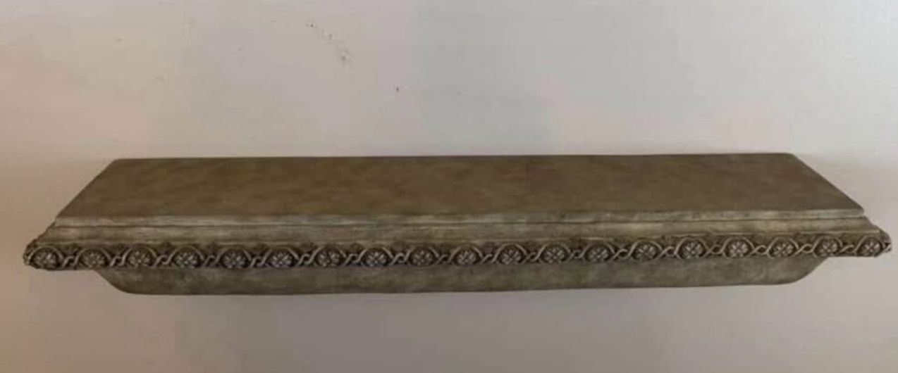 VenmoStone-look resin mirror and matching shelf. Mirror is approximately 52" tall, 35" wide and 3" deep. Shelf is approximately 8" tall, 48" wide and 10" deep.