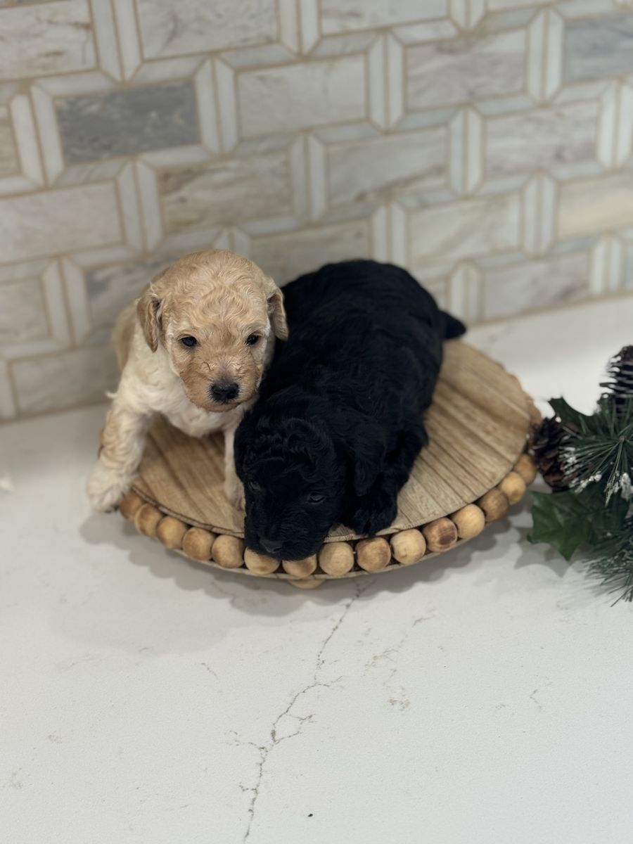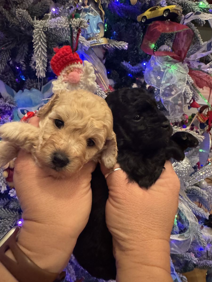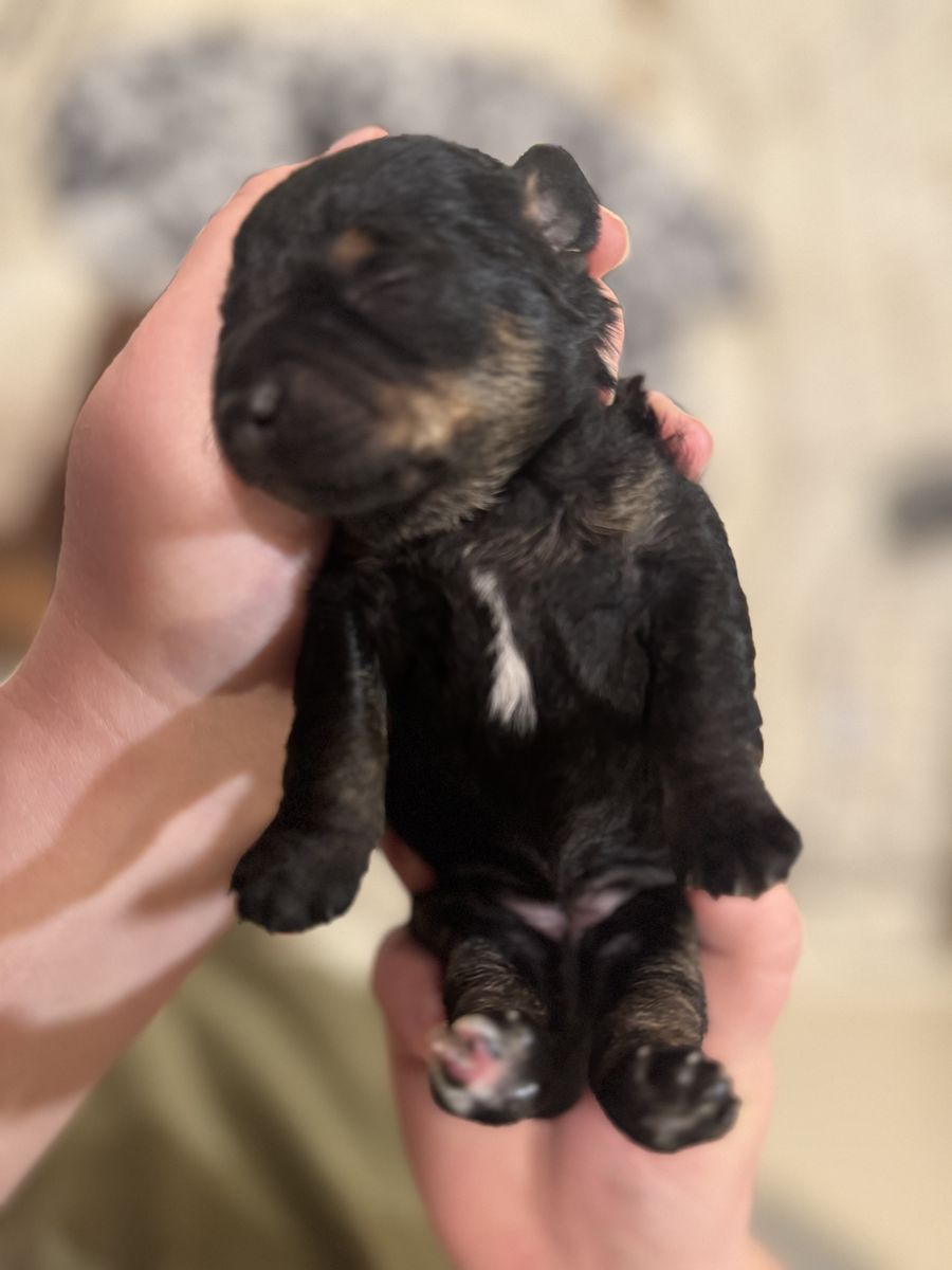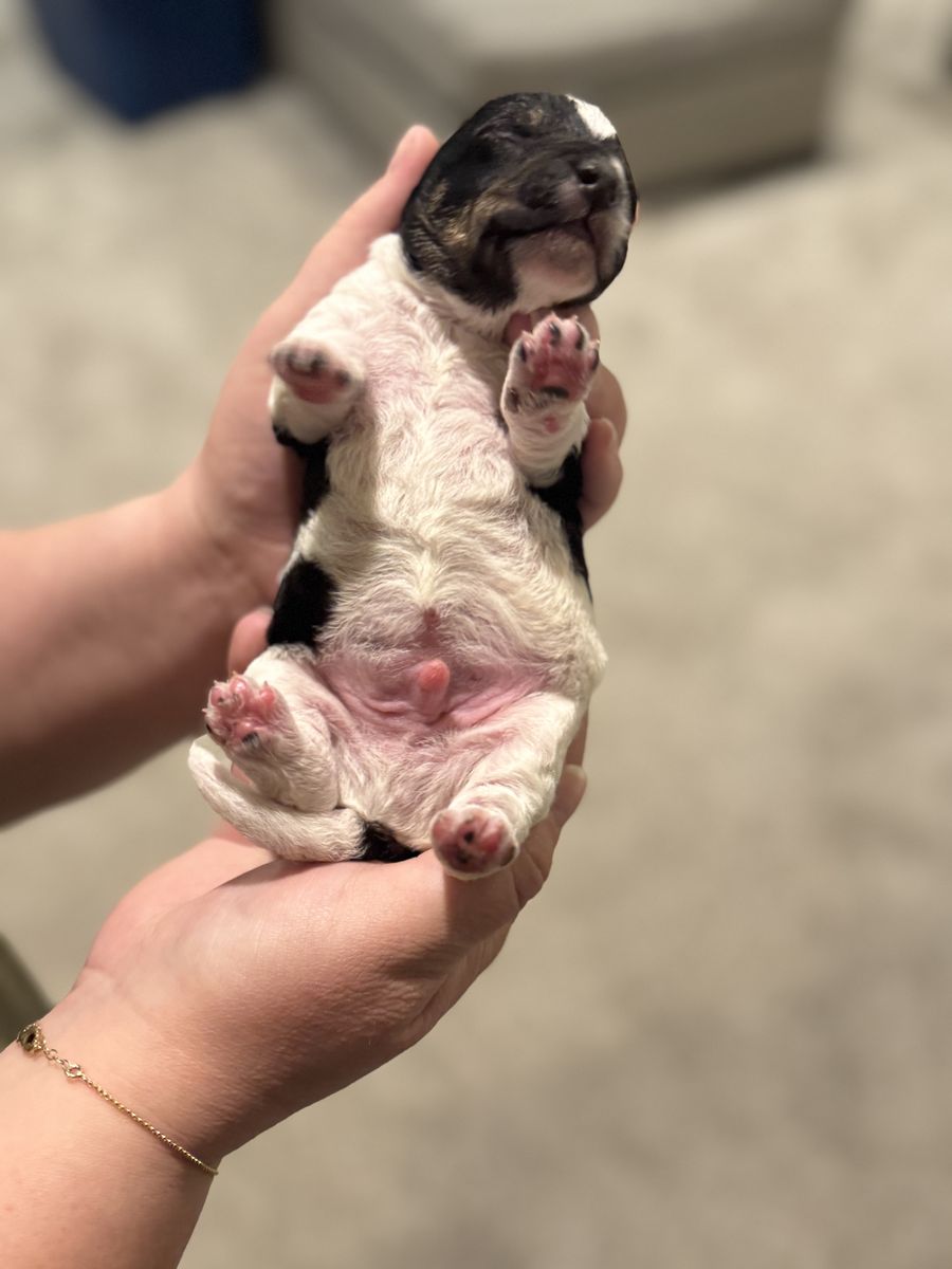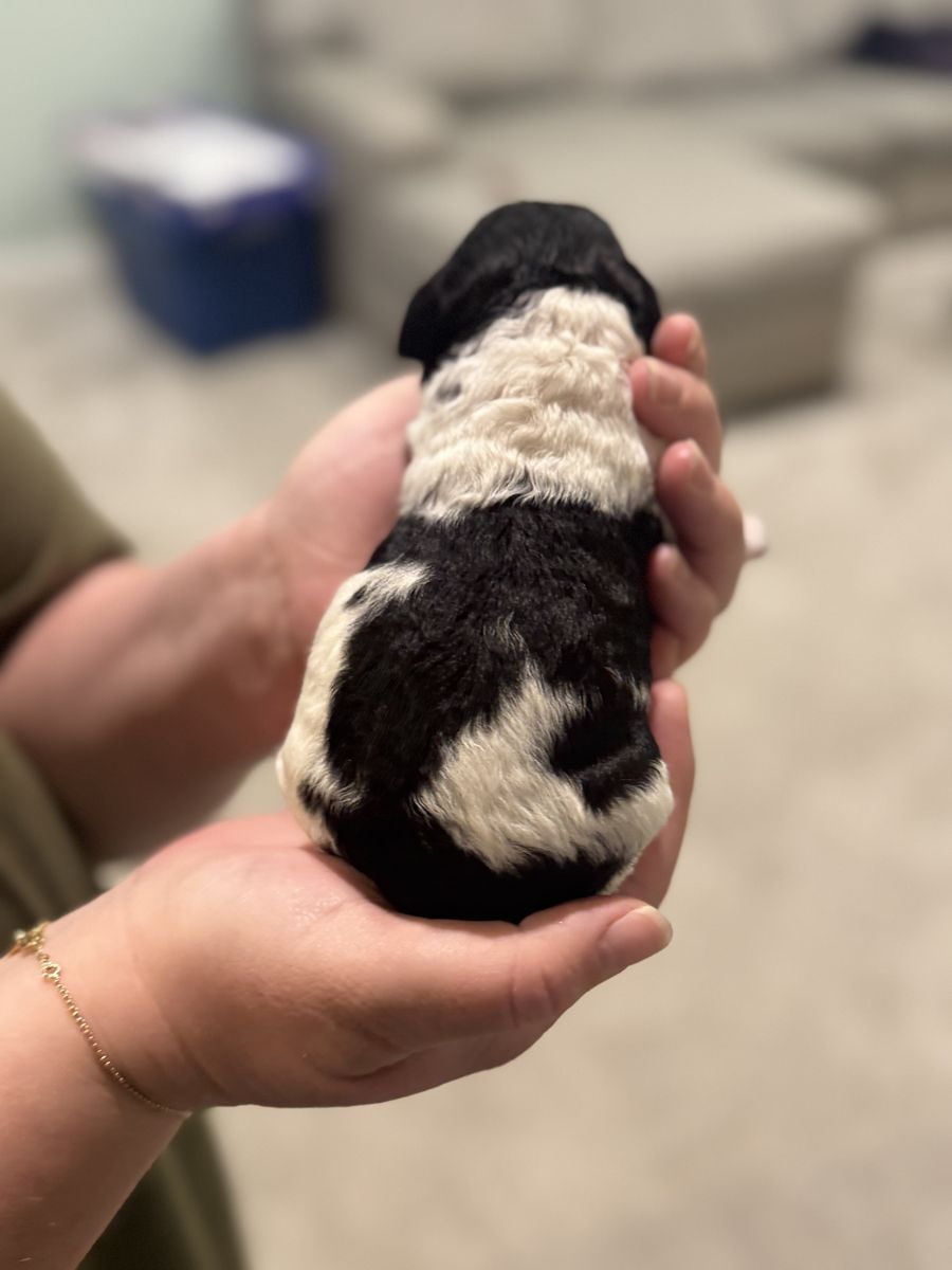 ApplePayPo is the best dog ever. He loves to be with his people and is extremely loyal. He is a black and white 4 pound parti poodle. He is AKC registered, and a proven stud. He has thrown a variety of coats, including: