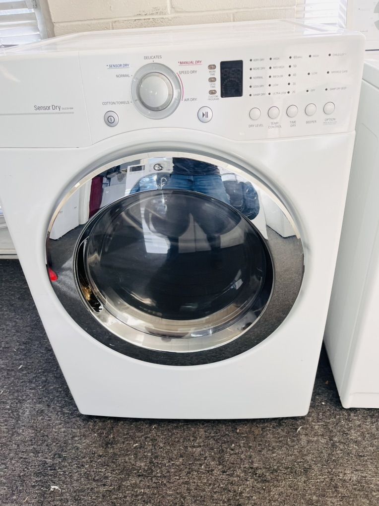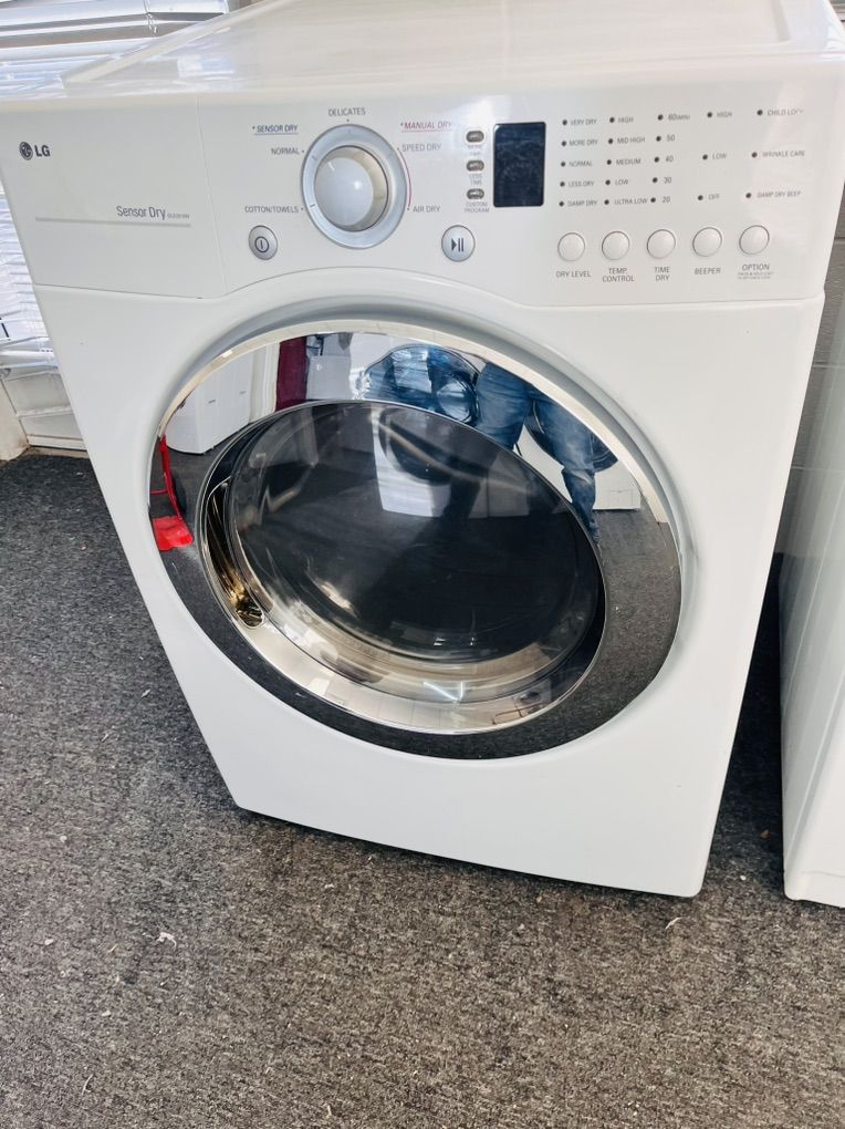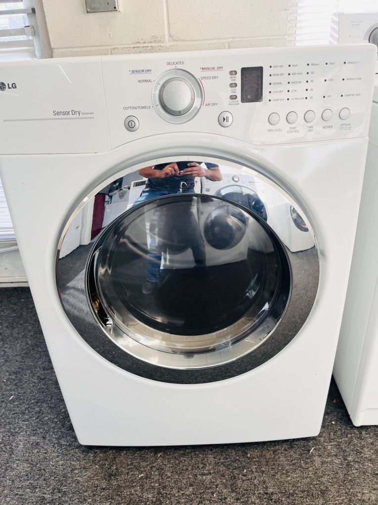 LG electric dryer in excellent working condition and very clean inside and out, it’s 7.4 cu dr with a stainless steel drum it measures 27” wide and can be stacked on most front load washing machines, there’s a tiny scratch on the door but nothing major. Other than that’s it’s An LG so very reliable. Comes with a 45 day warranty. Only $180 I can deliver and install for a little extra. Call 8015403075