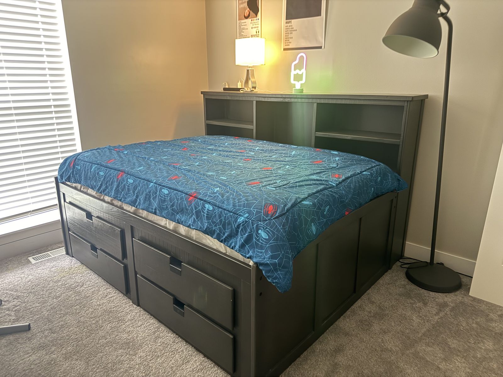 The bed is clean from a non-smoking house. We don’t have need for the bed since our son moved out and was only used for no more than six months.