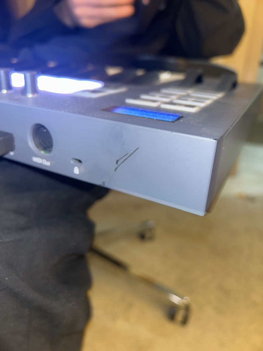 The keyboard works perfectly and has been well taken care of. There is a small cosmetic mark near the connector port (Shown in the second image), but it does not affect functionality and is barely noticeable.