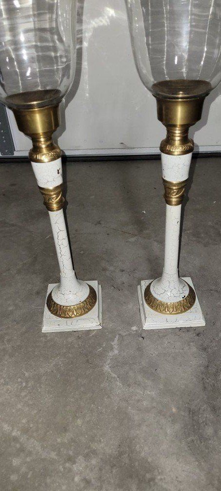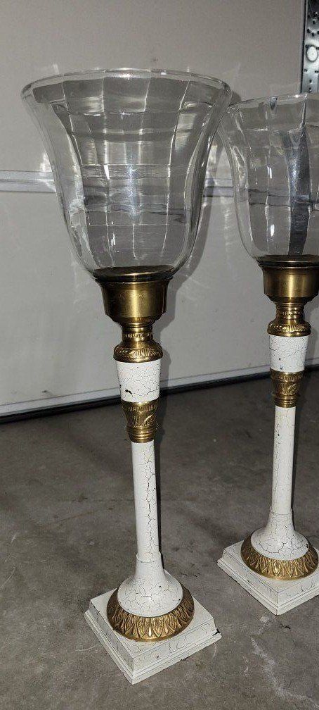 Vintage-style glass and brass hurricane candle holders. $125 for both