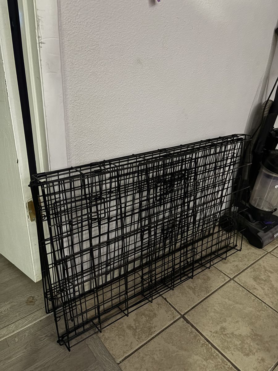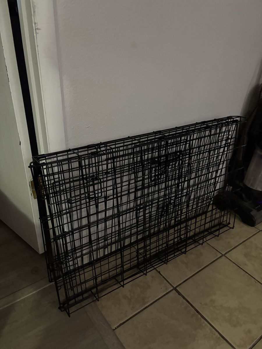 I believe is a medium sized. It’s a pretty decent kennel and almost new. My brother had his for his Rottweiler puppy. But he outgrew it and didn’t use it long. It also has a tray under the kennel.