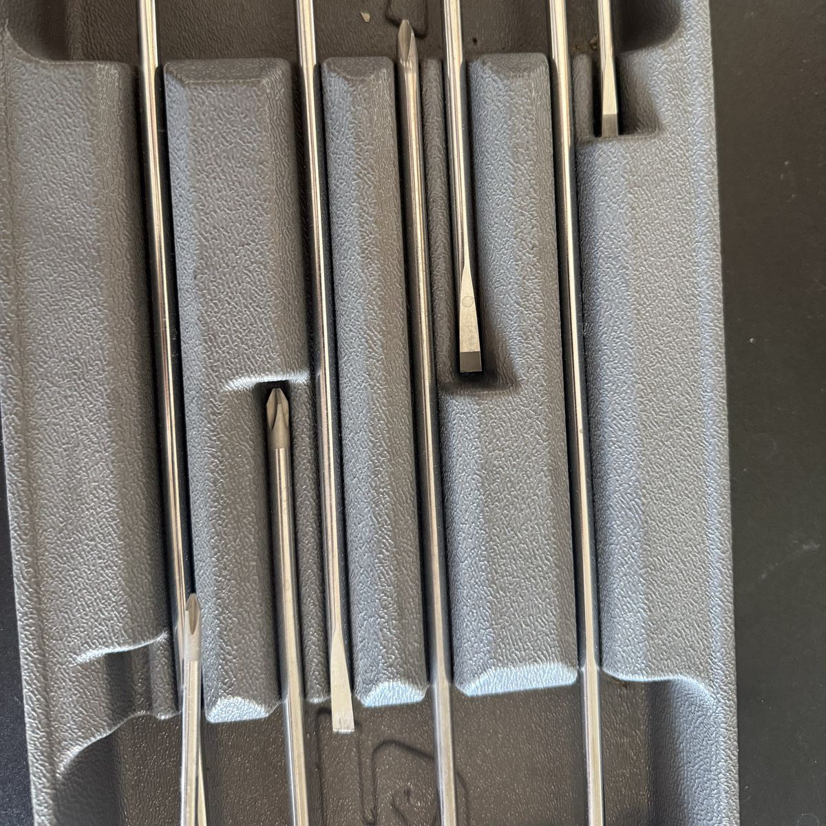 VenmoSnap-on long screwdriver set with tray. Includes multiple flathead and Phillips sizes.
