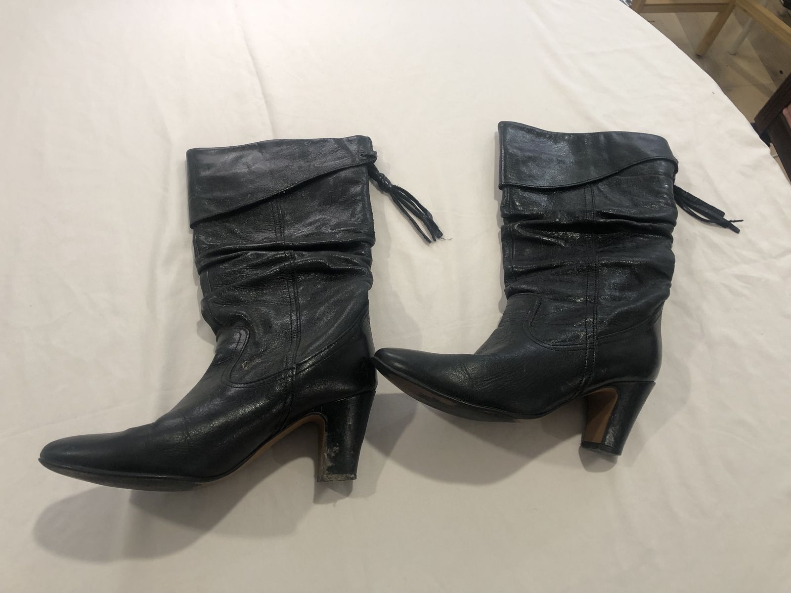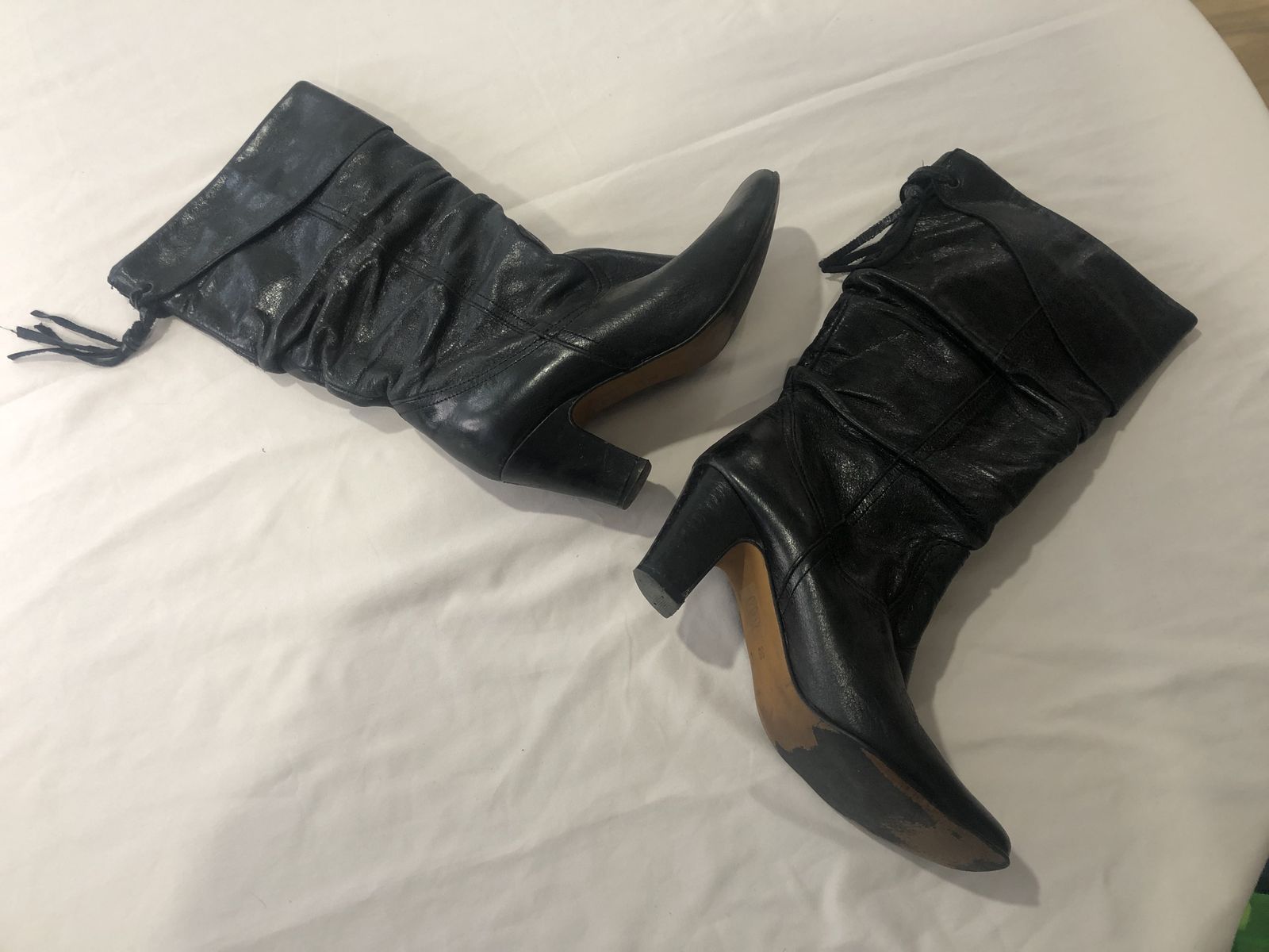 VenmoVintage women's black leather slouch boots featuring a pointed toe, a stacked block heel, and a drawstring detail at the top.
