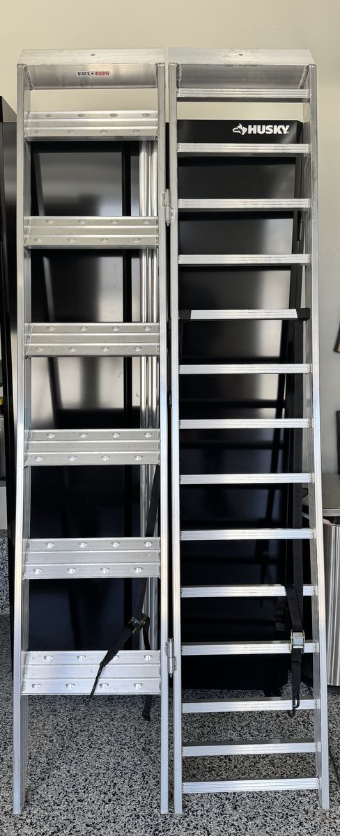 Manufactured of high-strength, lightweight aluminum 750 lb. ramp capacity; 400 lb. step capacity Measures approximately 6'10.25" L x 32.5" W Ramp and step combination allow one person to safely walk up while loading motorcycle Folds in half for easy transport and storage Slip-free traction steps for shoes and rung traction for tires Two safety straps included Black Widow