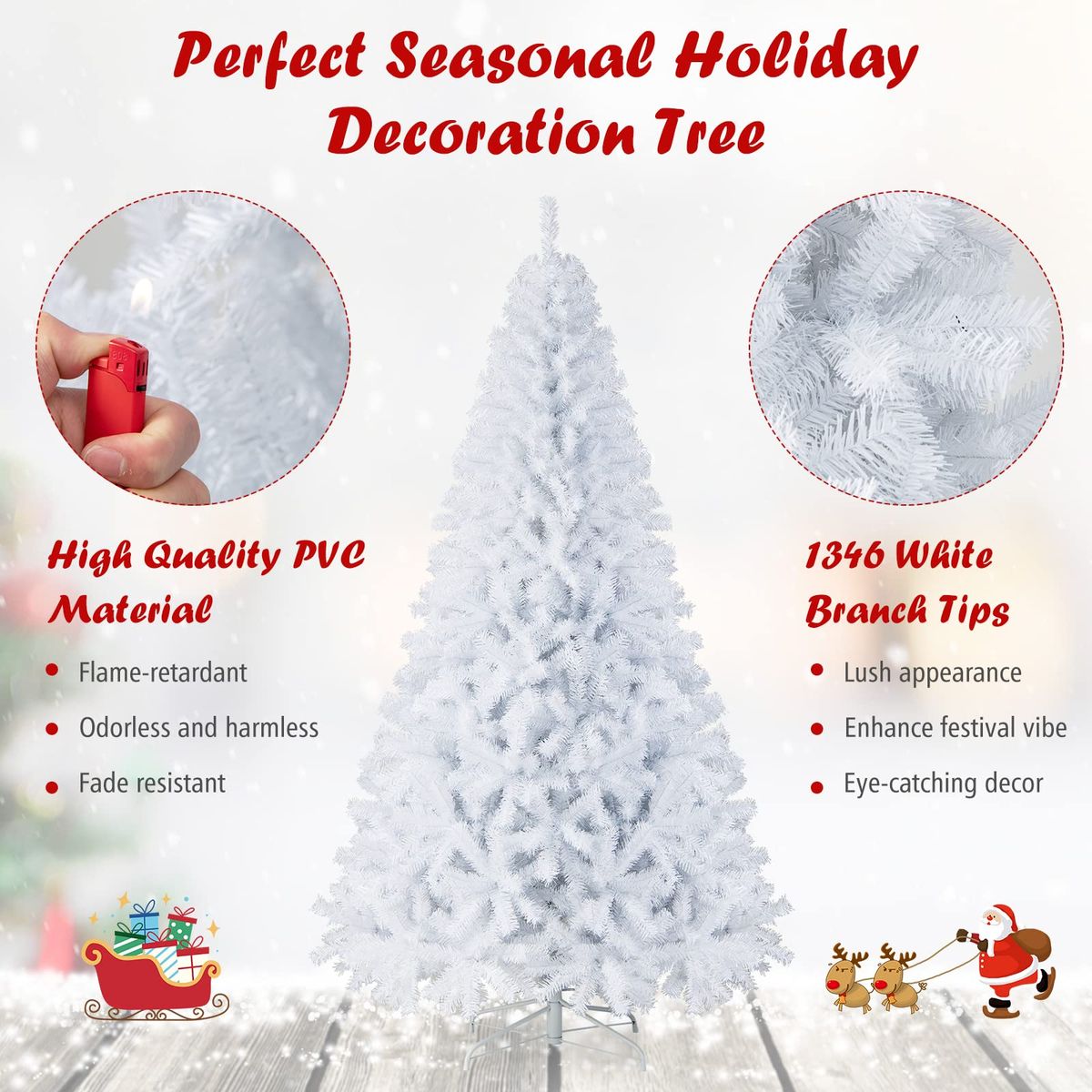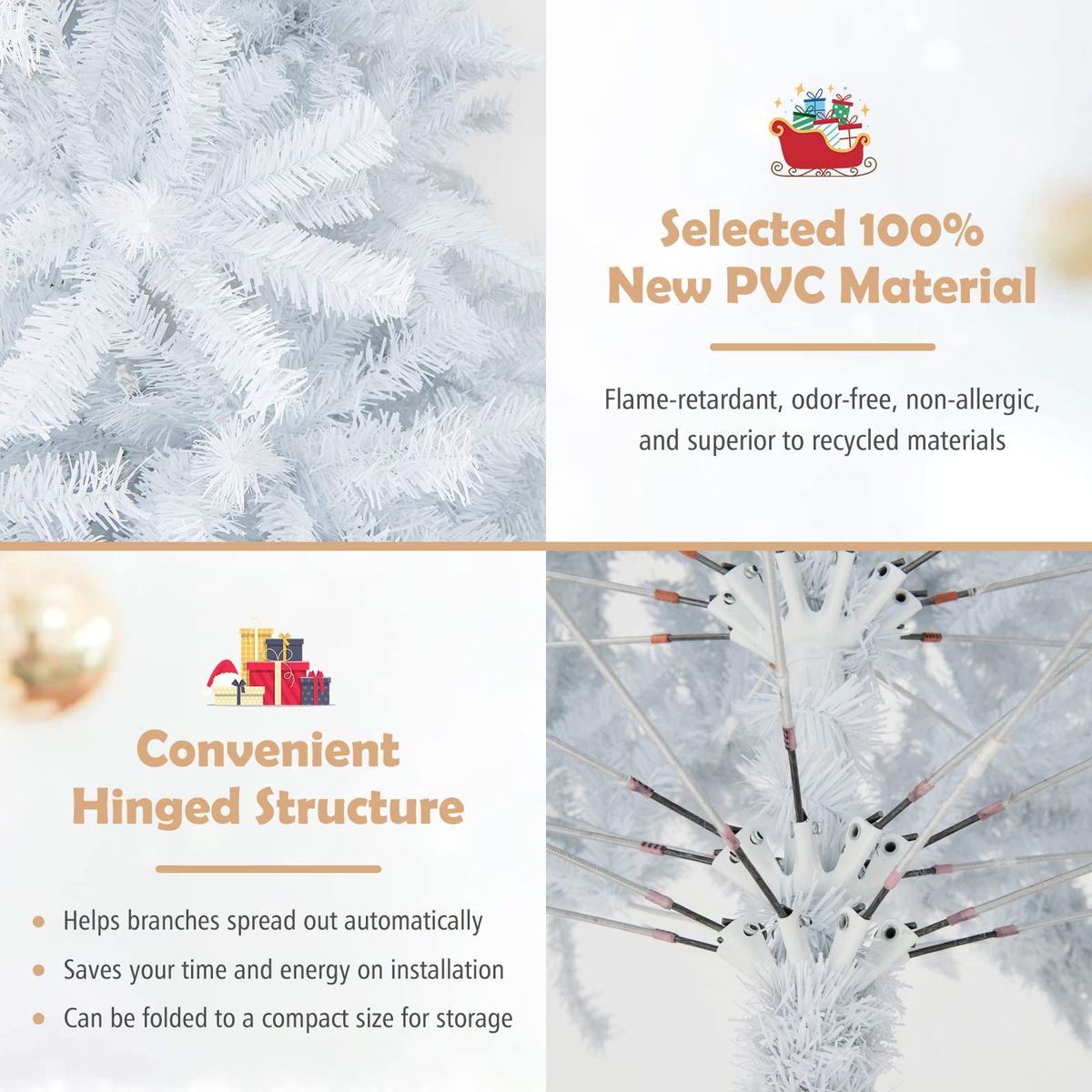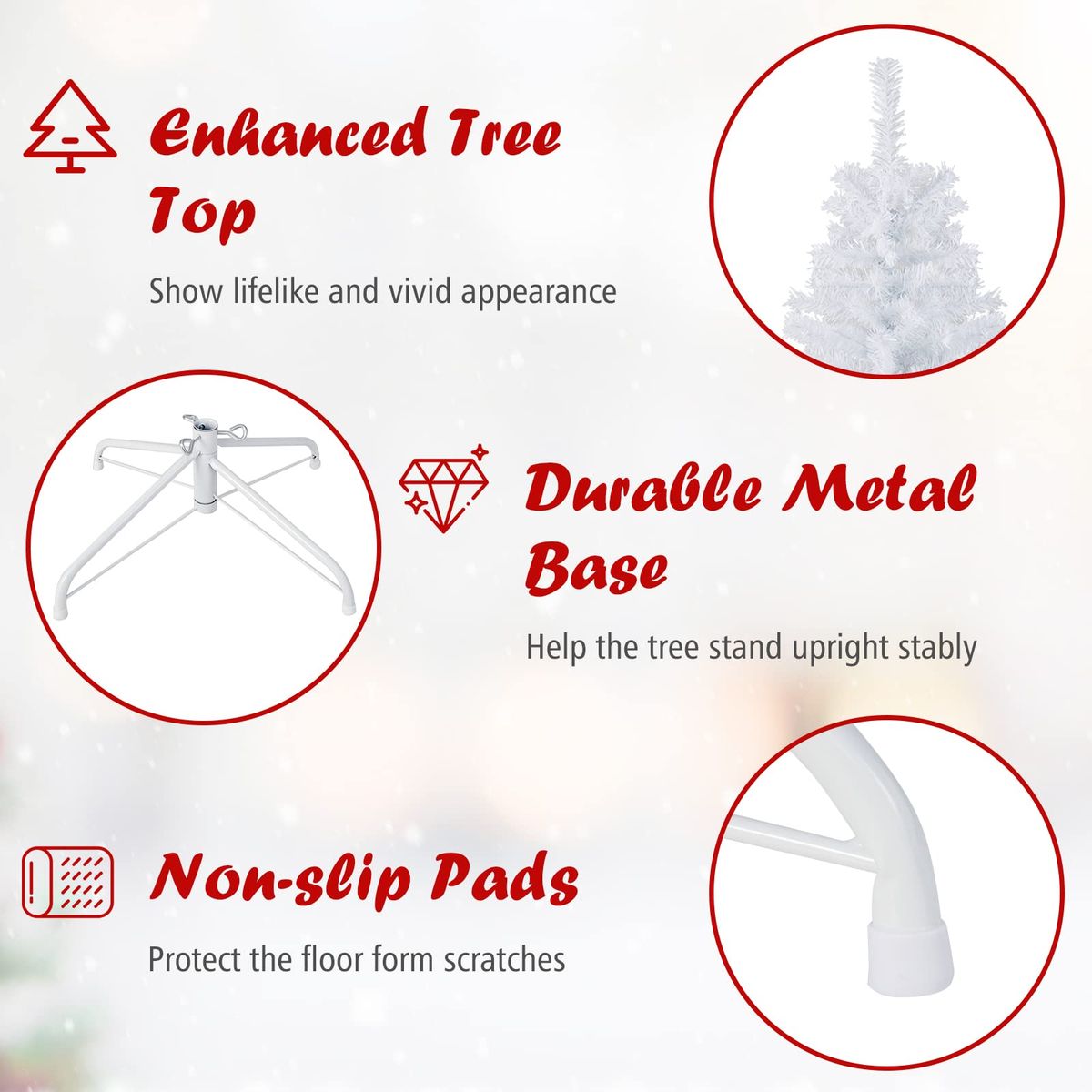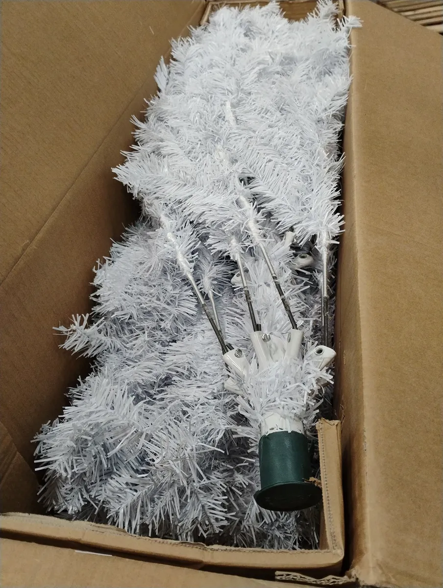 Description: Get into the festive spirit with the 7.5ft Hinged White Christmas Tree with 1346 Branch Tips. Perfect for indoor and outdoor decoration, this tree boasts a stunning appearance that'll help bring home the holiday spirit. The branches are designed to attach directly to the tree, making it easier to set up and take down. With an artificial yet lifelike look and dense leaves, this tree can be beautifully decorated with ornaments. Its stable metal stand and PVC plastic leaves ensure long-term usage, making it a reliable holiday decoration for years to come. Warm Tips: The tree may look messy, please refer to our pictures and manually adjust the branches to make them natural. In case of any quality issues or shipping damage, please feel free to tell us and get professional help. Features: Elegant white color gives romantic and holy feelings during winter season High-quality PVC needles of the tree with the resistance to flame and water Durable & safe for a long lifespan to recycle and reuse for your next holiday 1346 branch tips to create a fluffy appearance that emulates a real pine tree Hinged design allows you to easily assemble the tree or take it apart to store Sturdy metal base with non-slip feet provides the tree stable support Decor the white tree by hanging Christmas ornaments on the branches Specifications: Color: White Material: PVC + Metal Height: 7.5ft Width: 4.3ft Number of Tips: 1346 Net Weight: 19 lbs Package Includes: 1 x White Christmas Tree 1 x Instruction