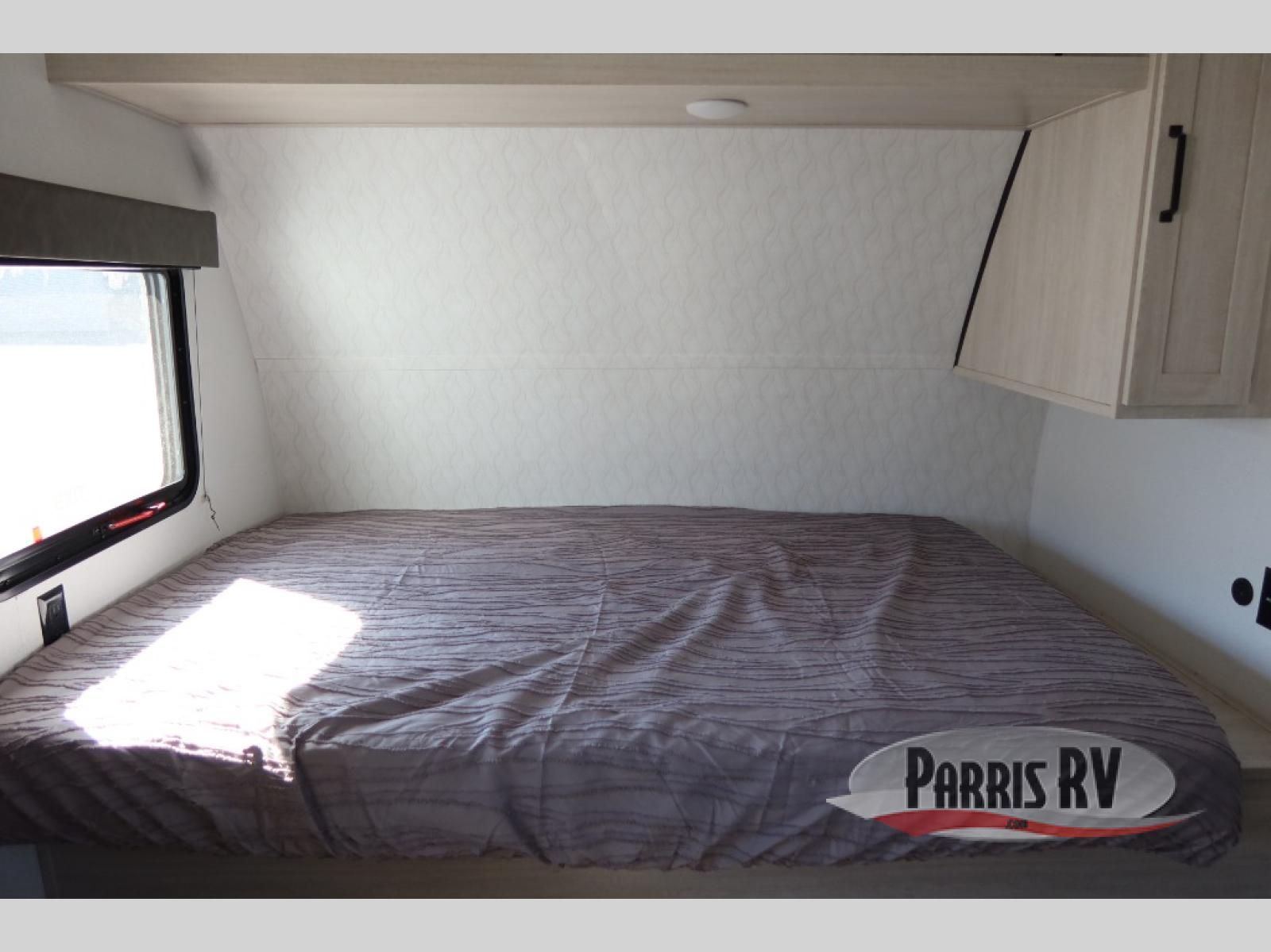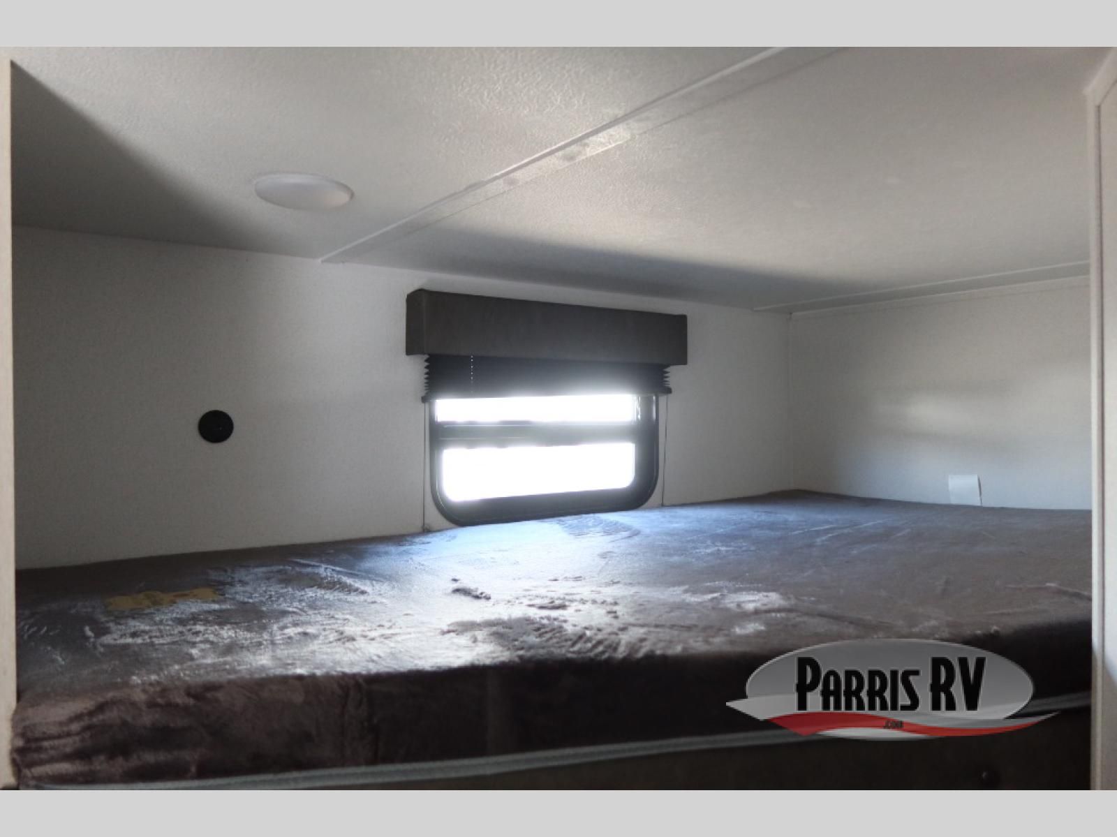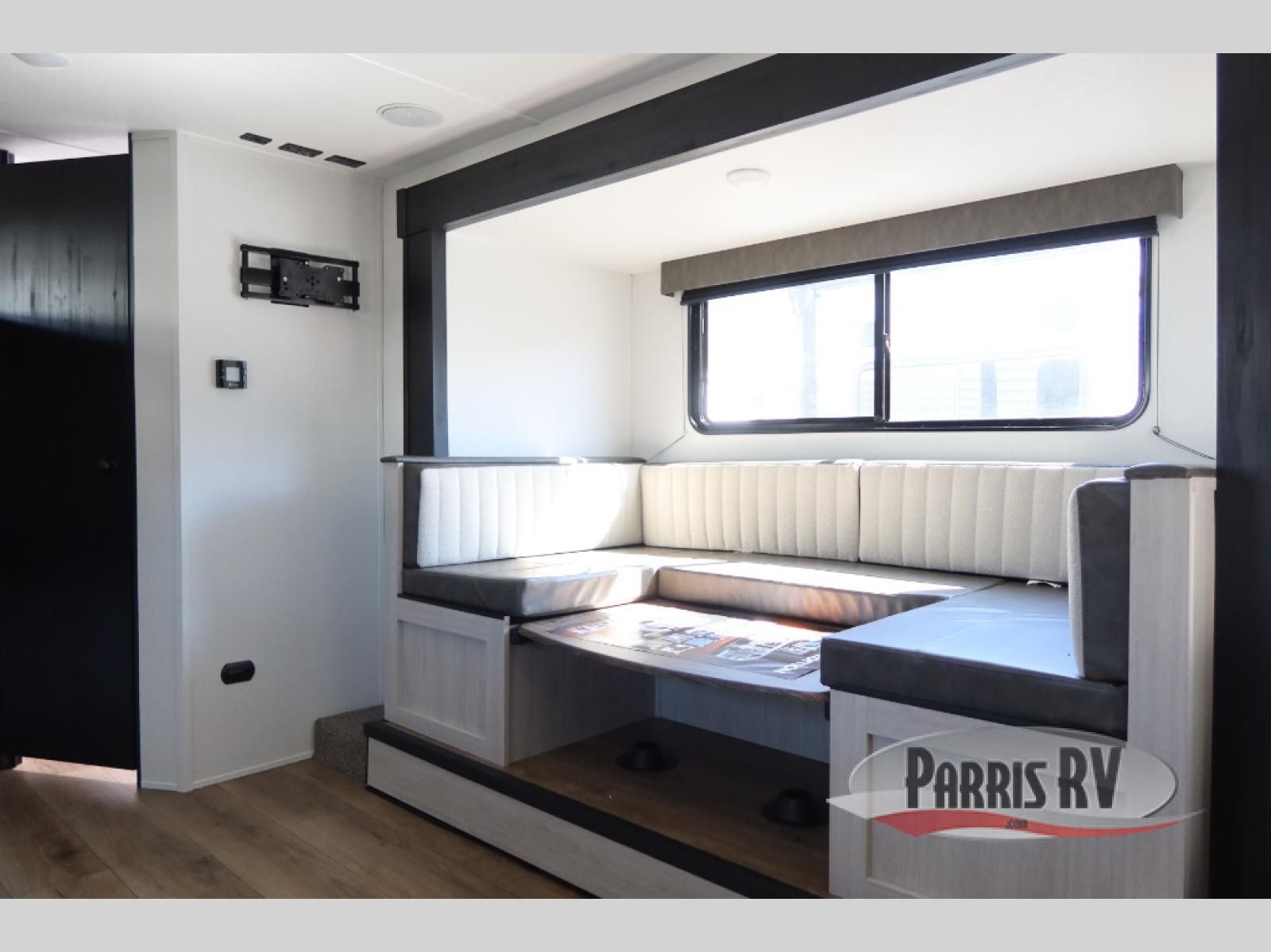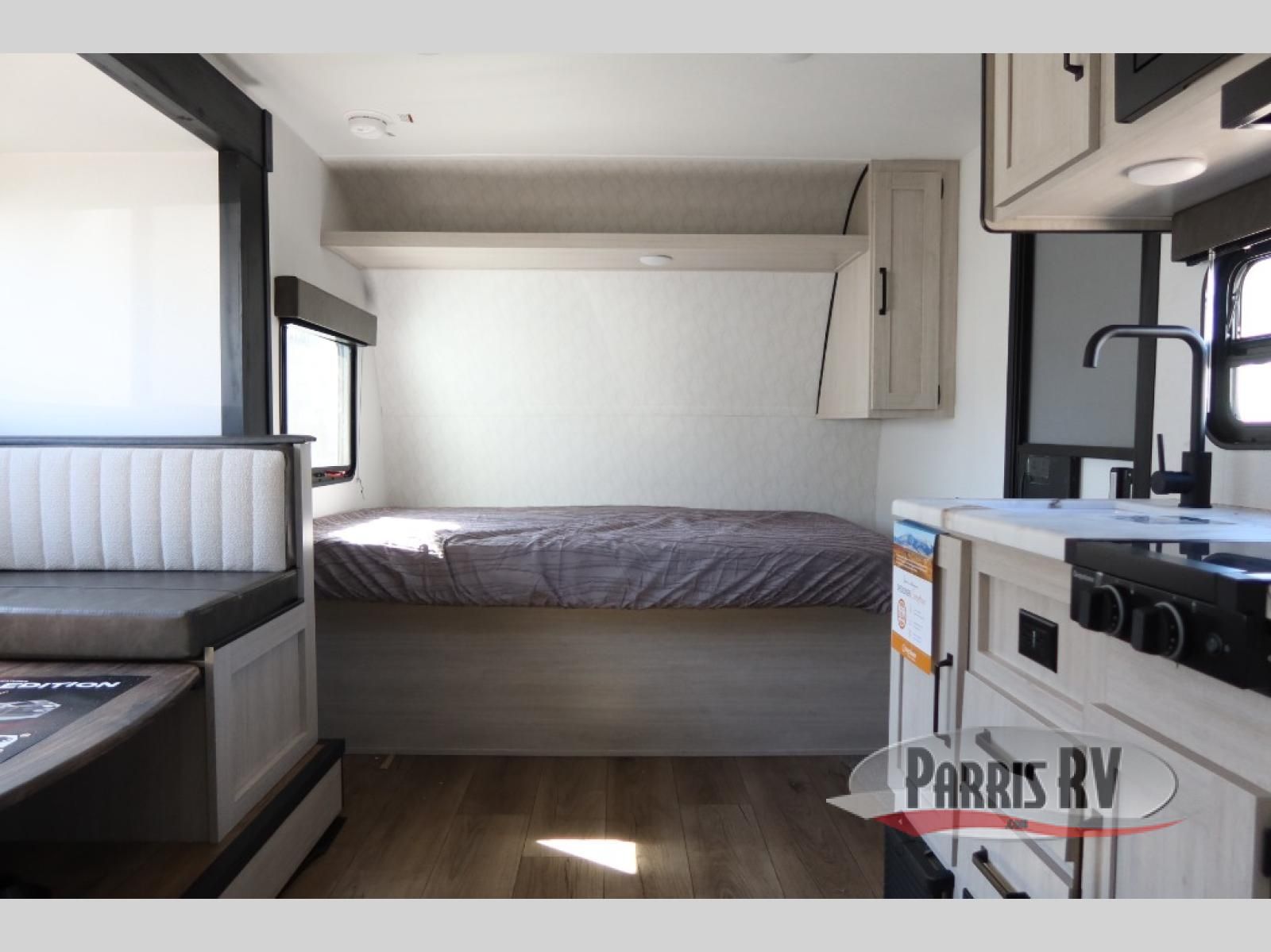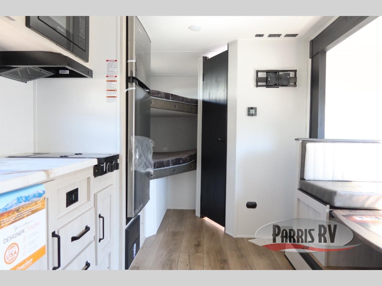 The whole gang will love camping in this travel trailer since there are double-size bunks for compact sleeping spaces and a slide out for more space to relax! The front RV queen bed is sure to provide a great night's rest, and you can choose the optional Murphy bed if you're needing more seating space during the day. Once you've made dinner on the two-burner cooktop, you can dine around the U-shaped dinette. And an optional mini kitchen with a griddle is available if you'd rather cook outdoors! This unit includes ample storage space for your things, including exterior storage and storage under the bunks!