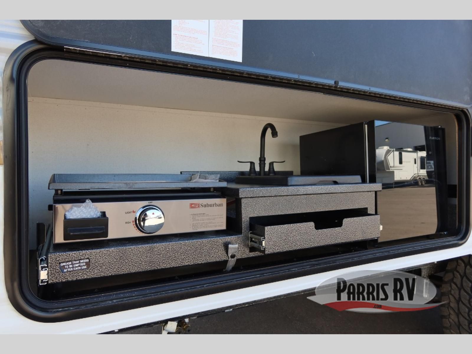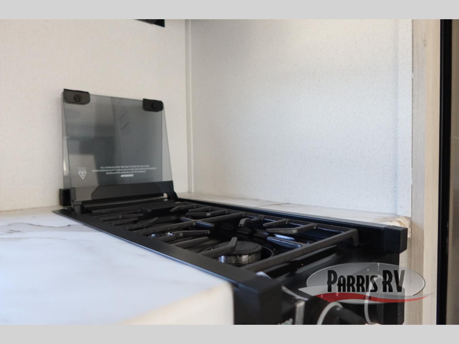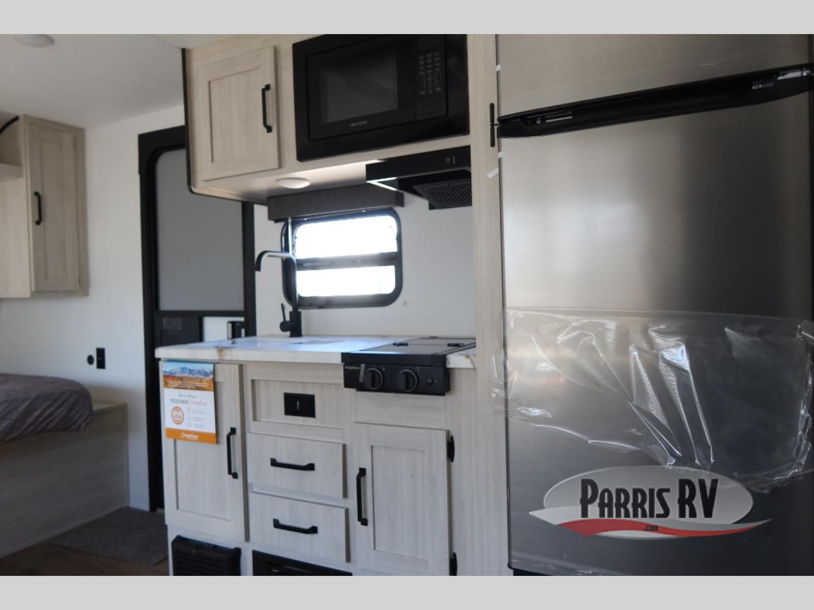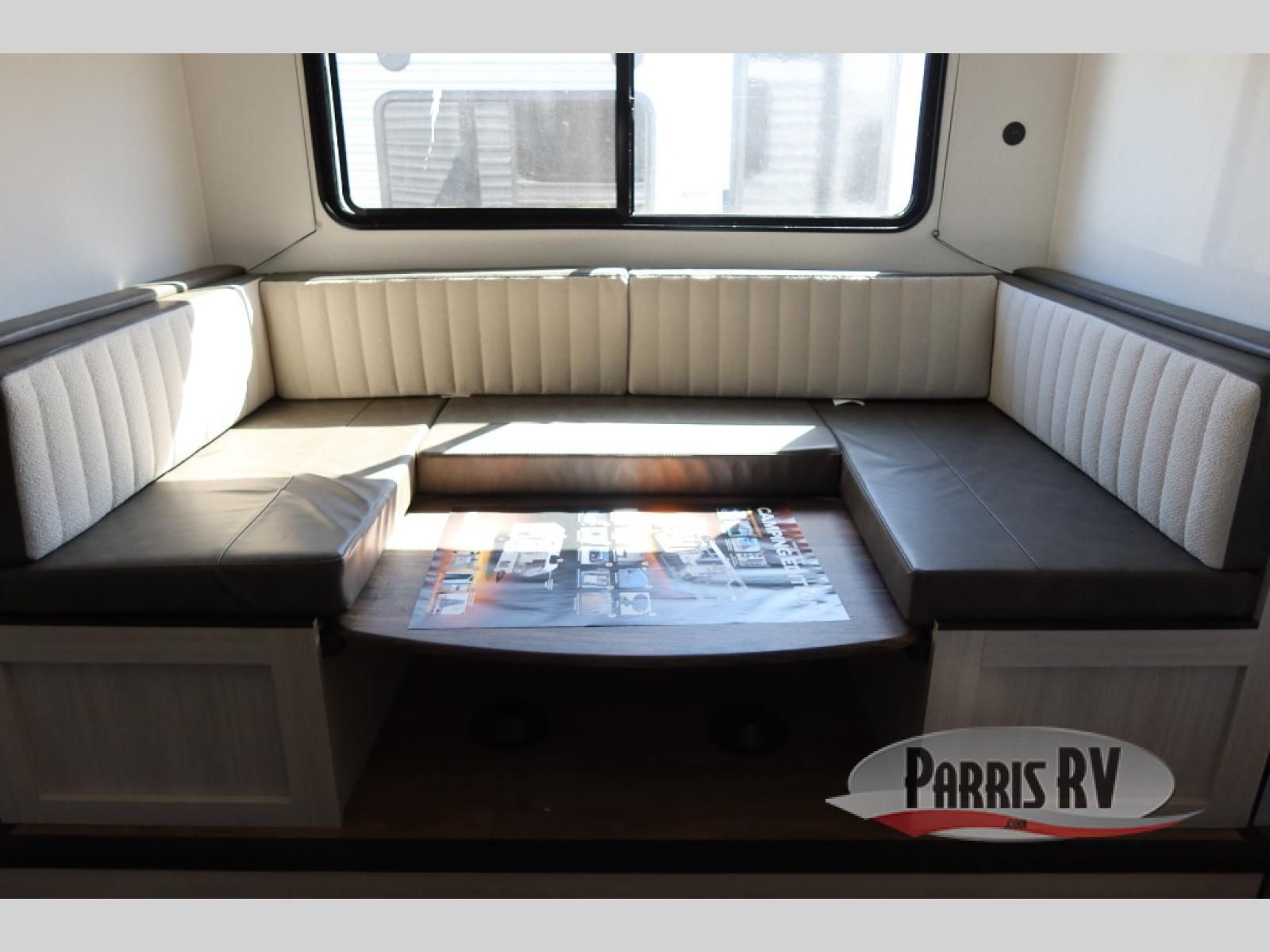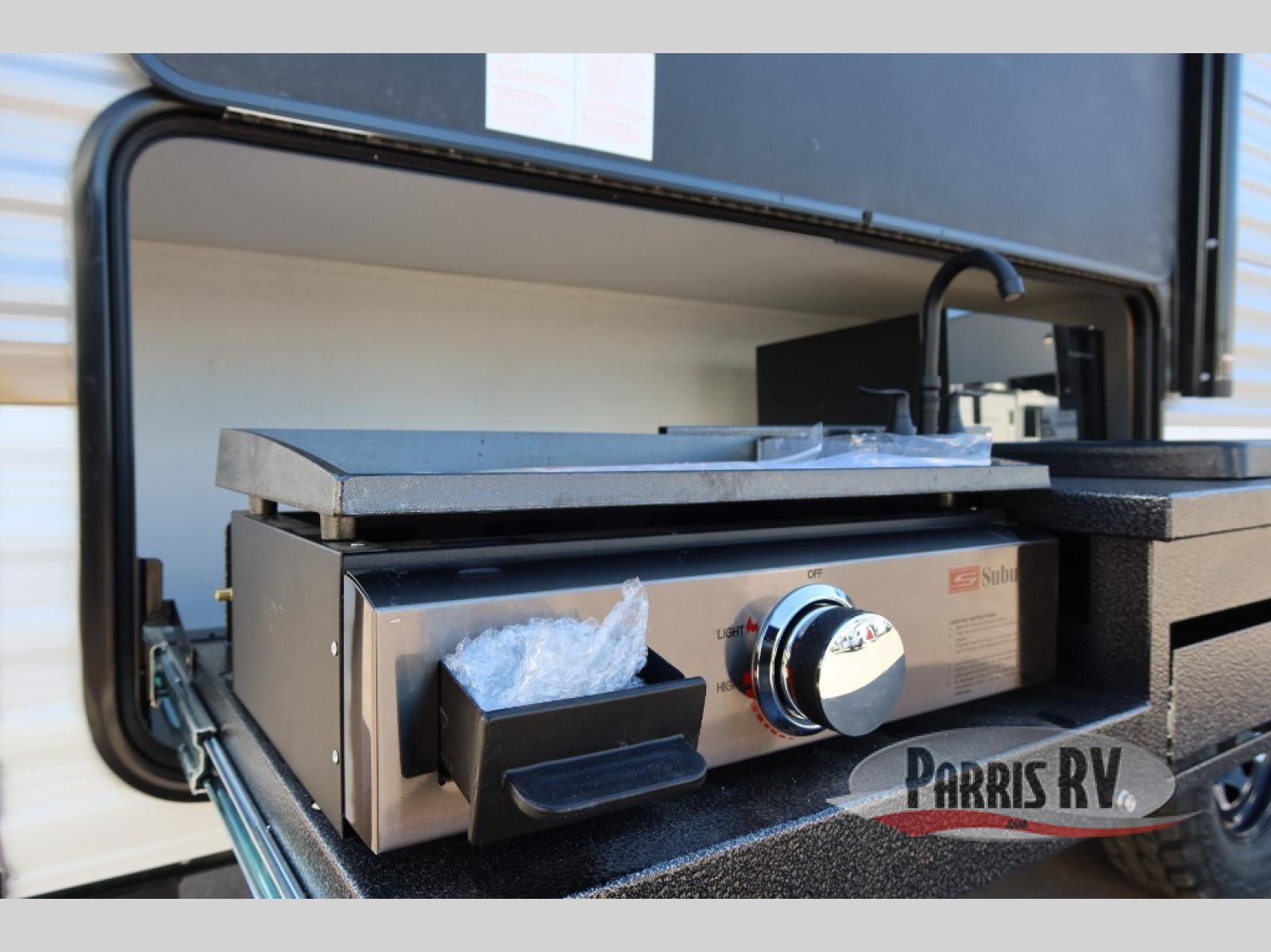 The whole gang will love camping in this travel trailer since there are double-size bunks for compact sleeping spaces and a slide out for more space to relax! The front RV queen bed is sure to provide a great night's rest, and you can choose the optional Murphy bed if you're needing more seating space during the day. Once you've made dinner on the two-burner cooktop, you can dine around the U-shaped dinette. And an optional mini kitchen with a griddle is available if you'd rather cook outdoors! This unit includes ample storage space for your things, including exterior storage and storage under the bunks!