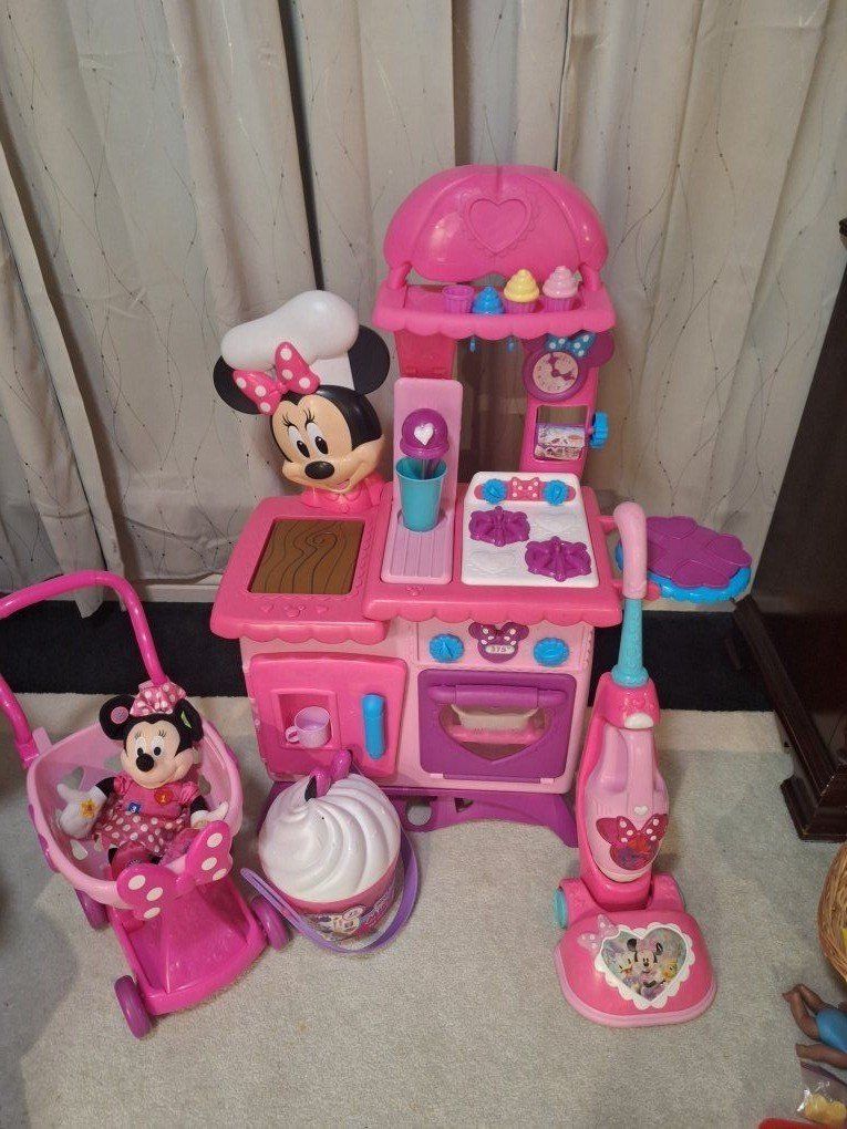 VenmoThis group includes the kitchen, a bucket of brand new accessories, additional fun kitchen accessories, a shopping cart, a 2 in 1 vacuum, and a talking Minnie Mouse. There will be additional shopping play food of each food group and a range of bright colors. The hot plates, vacuum, and doll all have new batteries. I can reduce the price $8.00 if you prefer not to have the batteries. All accessories have been sanitized and are ready for play.