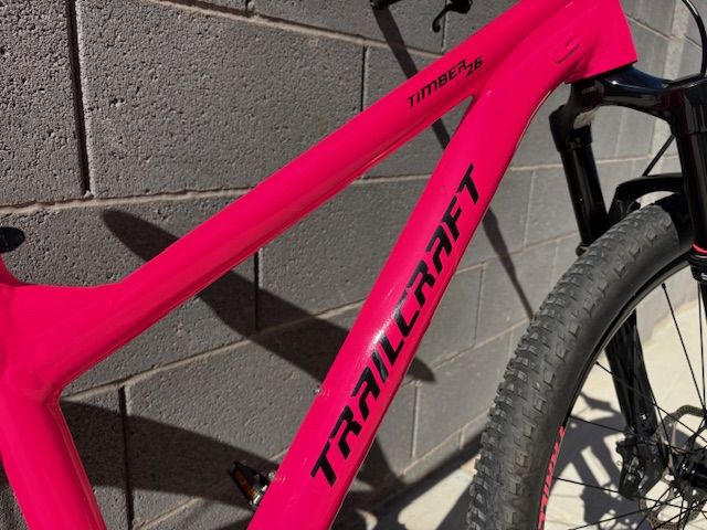 Selling a Trailcraft Timber 26 Pro in a standout hot pink color. This is a premium, lightweight performance mountain bike designed specifically for youth riders—and this one is in absolute mint condition.