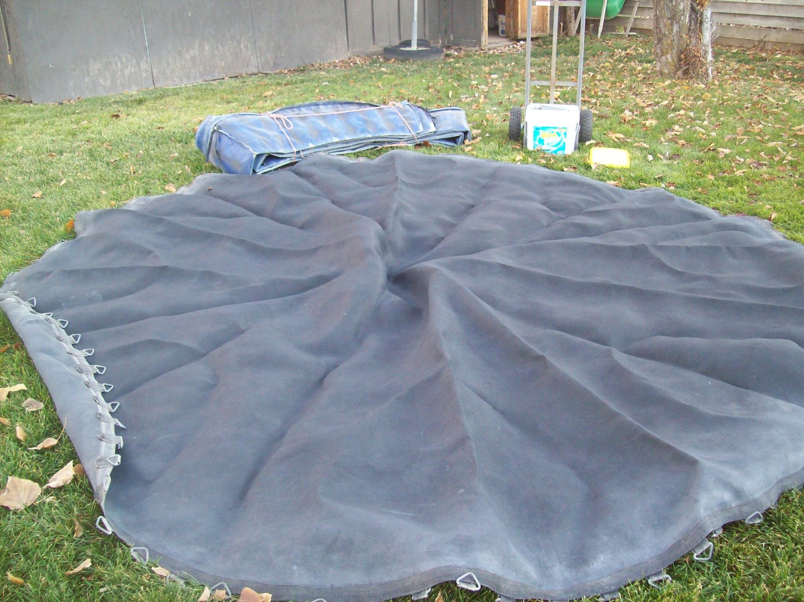 Trampoline mat for sale with spring cover pad. Round shape 12' in diameter fits a 14' frame with springs $75.00CASHOnly. Winter stored inside. Good condition. $95.00CASHONLY. Text 801-643-5130 to buy