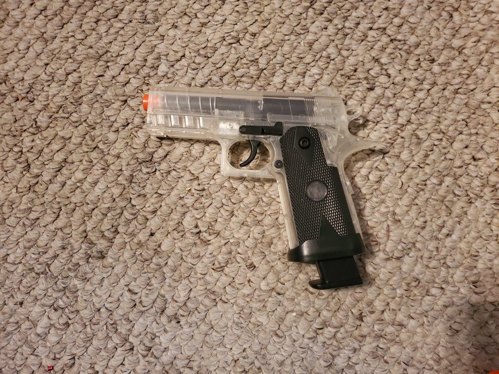 VenmoSpring-powered airsoft handgun with holster. The action has always felt a bit stiff to me, but it works great. I think it's about ~180 fps.