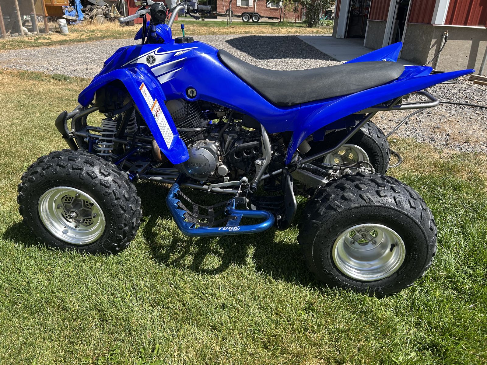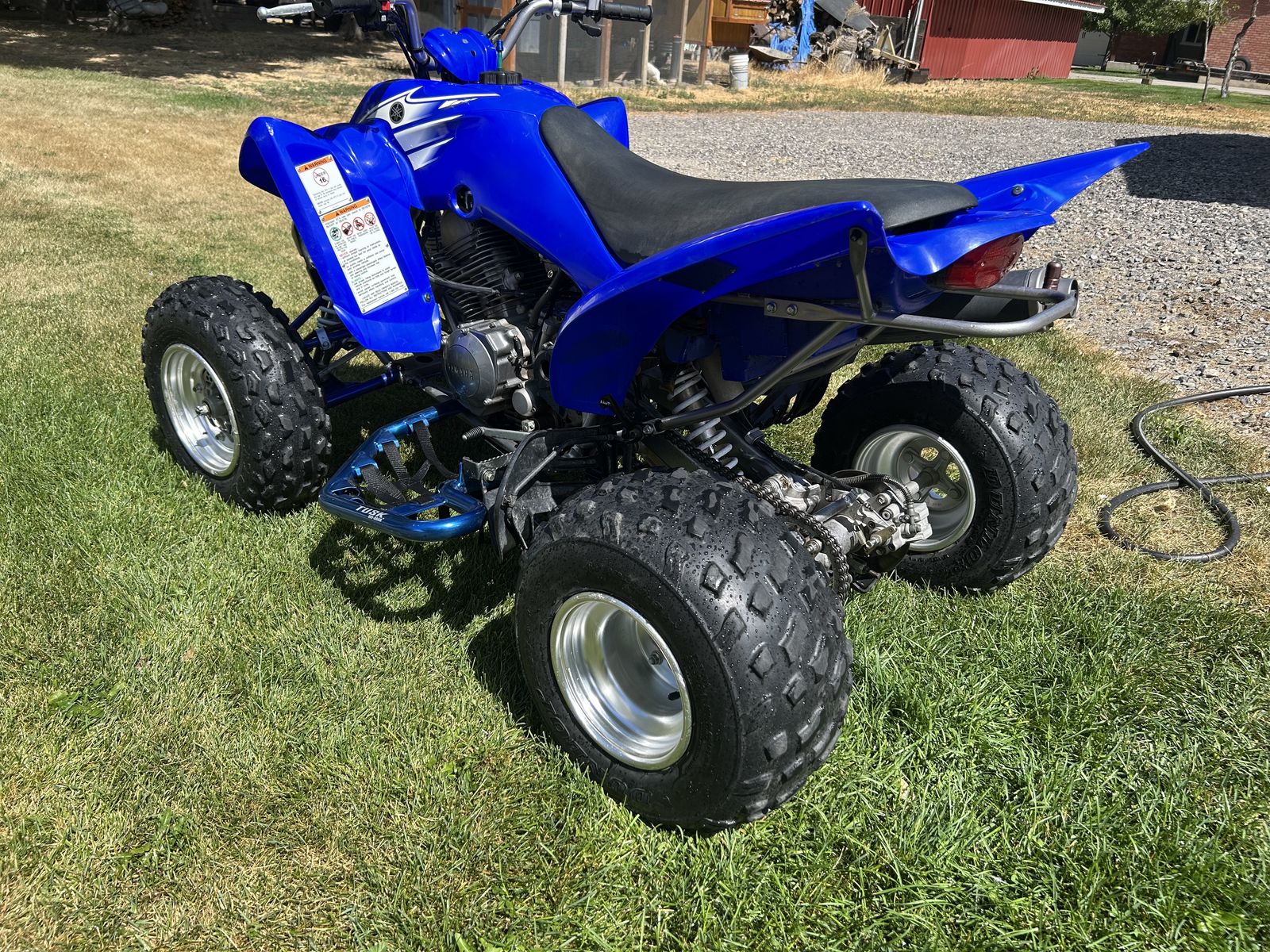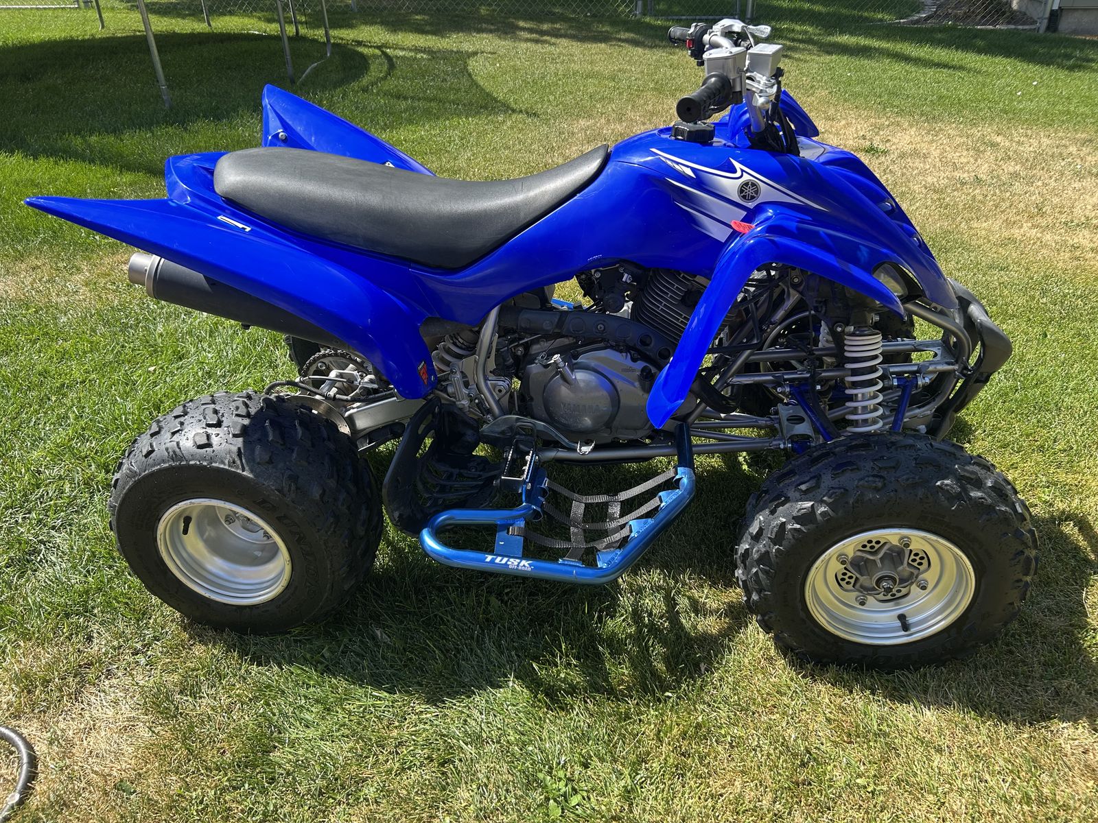 VenmoThe 2007 Yamaha Raptor 350 is a reliable, lightweight sport ATV featuring a 348cc air-cooled, 4-stroke engine with a 6-speed manual clutch and reverse. Known for its versatility, it is suitable for trail riding, dunes, and entry-level riders. Common features include a 2.4-gallon fuel tank, electric start, and a 43.1-inch width. Title in hand, new paddles on black wheels included. Accessory nerf bars, flag holder.