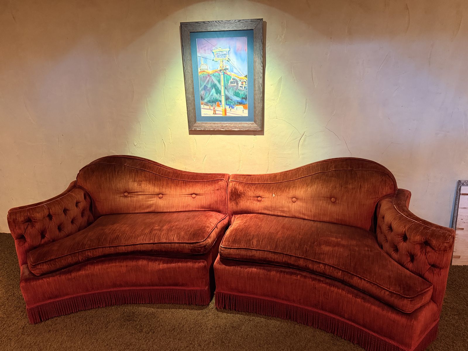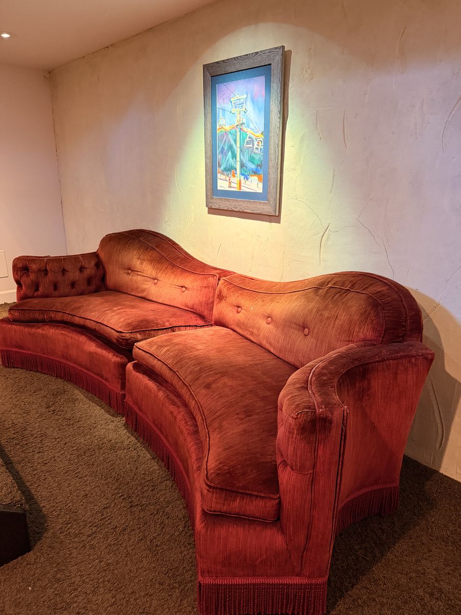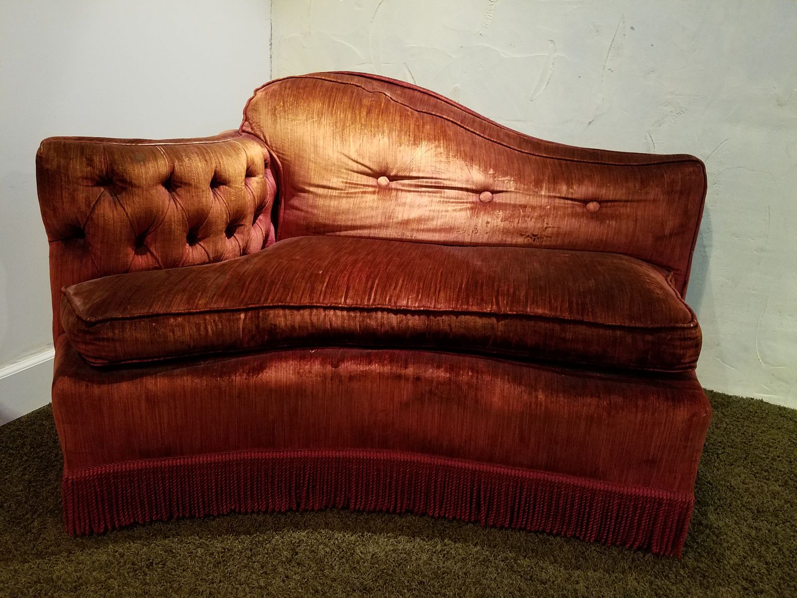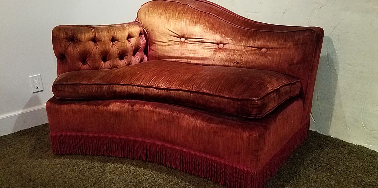 This is artistic couch set and with some love could be so cool in the right environment. Couches are approx 52 inches long by themselves and approx 104 inches long when pushed together. These are curved and have unique shaping. Not your standard box couch. I will sell indivudallly or as a set. The set price is the same as indivudal price.