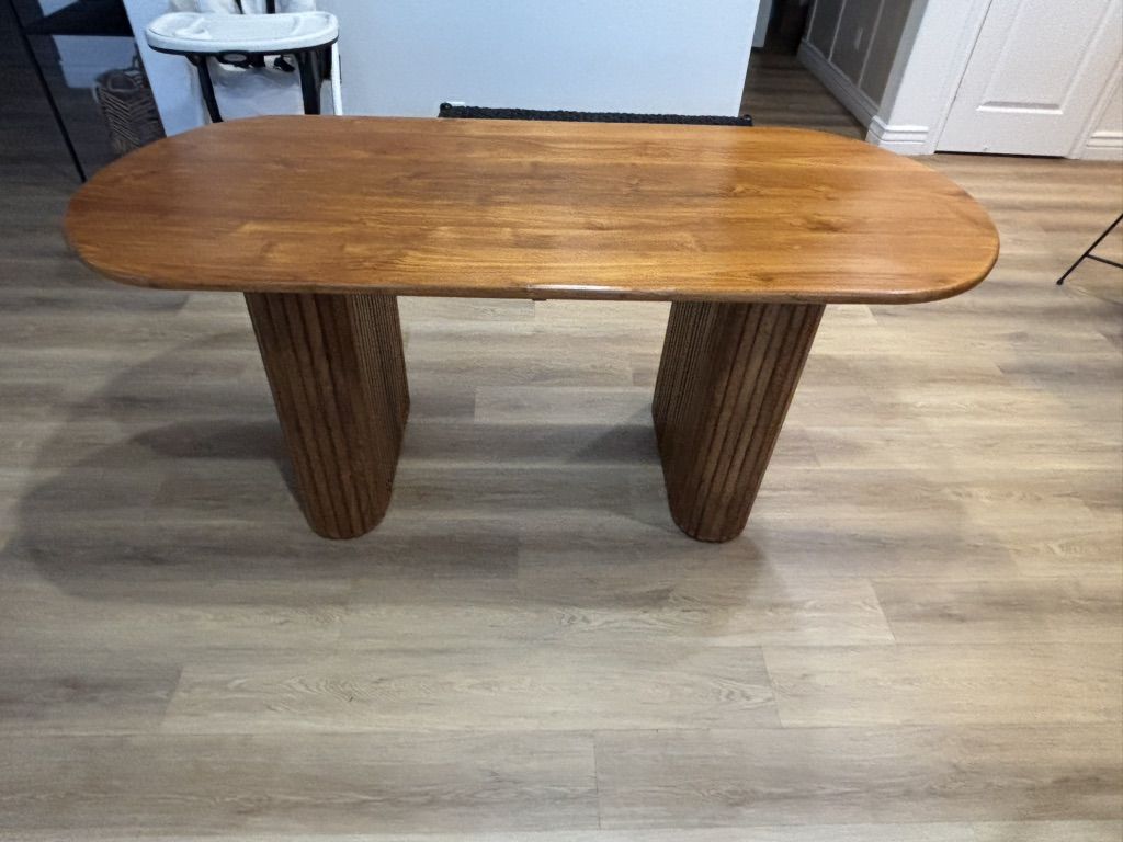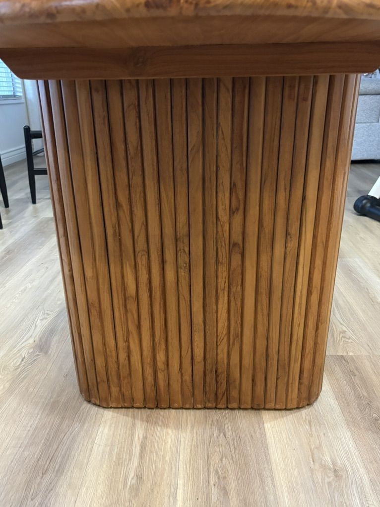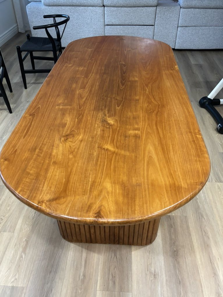 Beautiful solid teak wood dining table imported from Asia. This piece features a rich, warm wood tone with a smooth oval top and a unique fluted pedestal base that gives it a high-end, modern look.