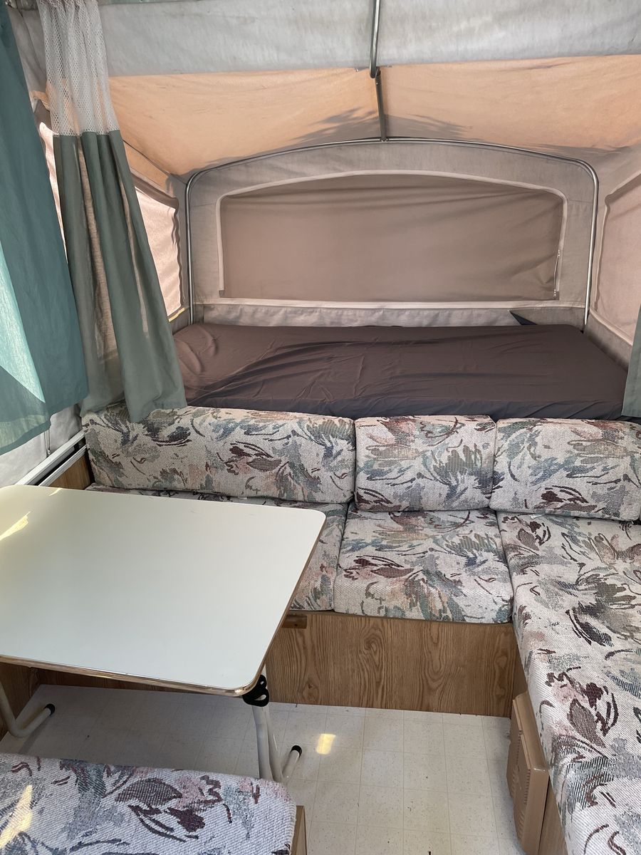 ApplePayVery clean tent trailer with 4 yr old canvas. Has a king slide and a queen slide All lights, fridge, and heater work. Has a 100 watt solar panel installed and 2-6V batteries. All beds and seat cushions are in great shape
