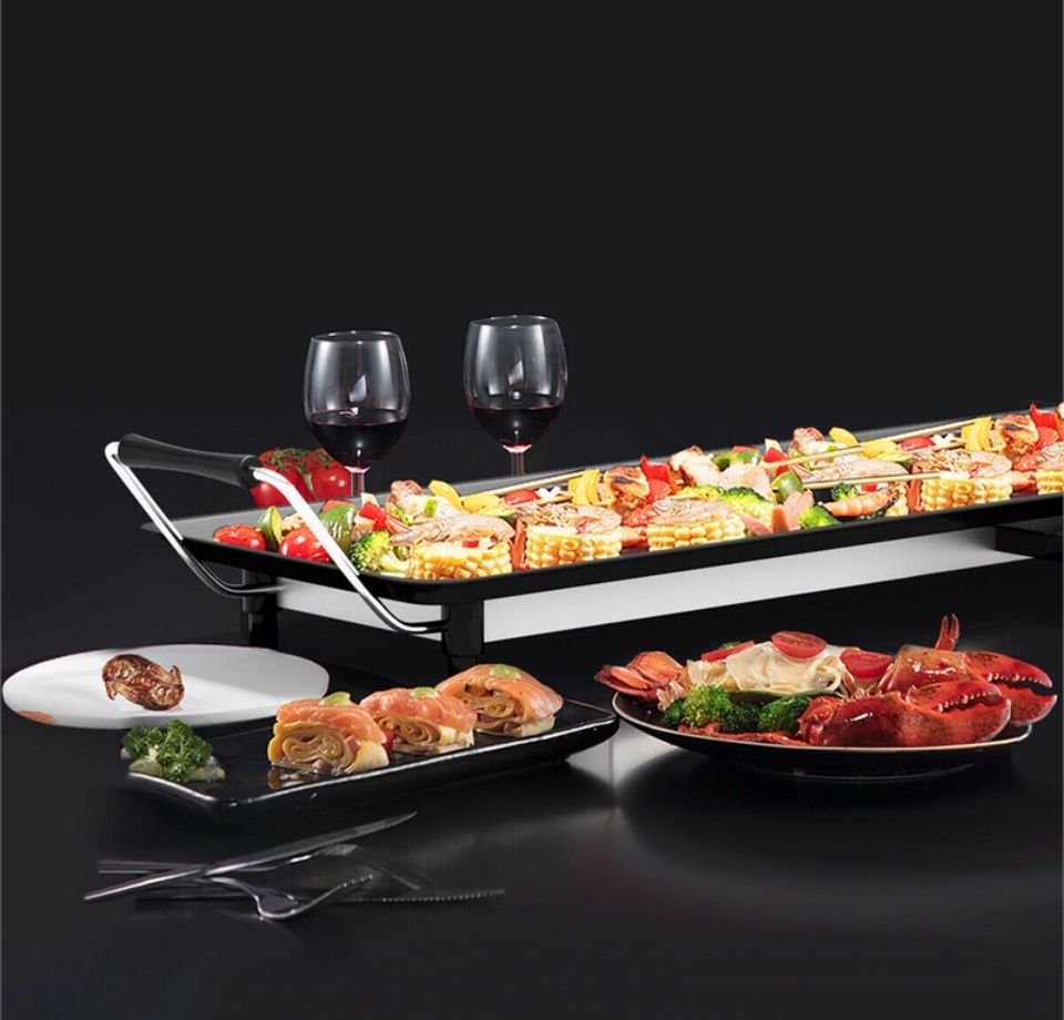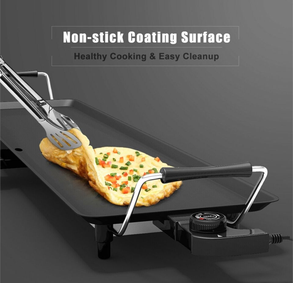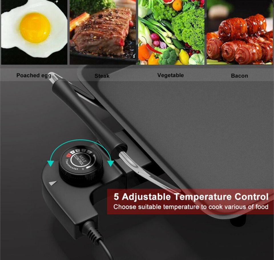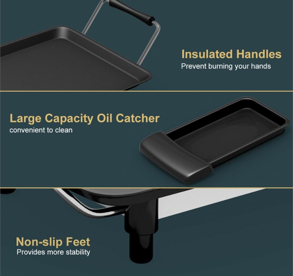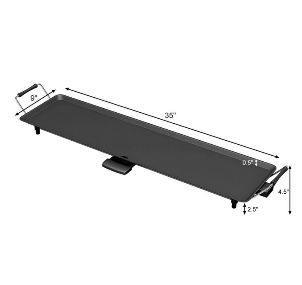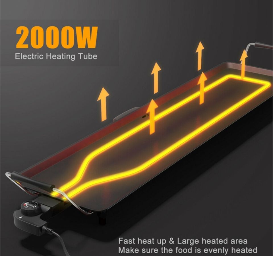 ADJUSTABLE TEMPERATURE: Everyone will become a good cook with this electric griddle, as our electric table grill owns 5 temperature settings by controlling the adjustable thermostat; so that you can choose the most suitable temperature to cook various of food to the best dishes, such as beef, chicken, fish, vegetables, etc. HEALTHIER & LOW-FAT EATING: Most people worry about too much fat they are eating when enjoy the BBQ , how about you? Our table grill is the just right product to solve your concern. Premium nonstick surface offers you a stick-free cooking experience for meat, vegetables, fish, fried dishes. It requires little grease on the non-stick surface, thereby producing healthier food. Cleaning can be done easier as well. JOIN IN COOKING TOGETHER: Spacious 35" by 9" size is great for hosting parties or family meals. Abundant food can be added on it with high efficiency. Besides, it comes with 6 free wooden spatulas and 2 egg rings, multiple people can enjoy a happy cooking experience at dinner time together. INSULATED HANDLES & NON-SLIP FEET: There are 2 handles on each side with insulated cover for convenient moving without heating or burning your hands. Furthermore, our teppanyaki table grill is equipped with 6 anti-slip feet, which provides more stability and protect your table from heat meanwhile. ENJOY DELICIOUS BBQ FOOD ANYWHERE: Featuring portable design, it is not only great for family cooking, indoor BBQs, dinner parties but also suitable on camping, caravanning and self-catering holidays. The designed detachable power cord adds more convenience for you to carry this nonstick griddle easily anywhere in your favor. Slide-out Drip Tray can be removed and cleaned easily.
