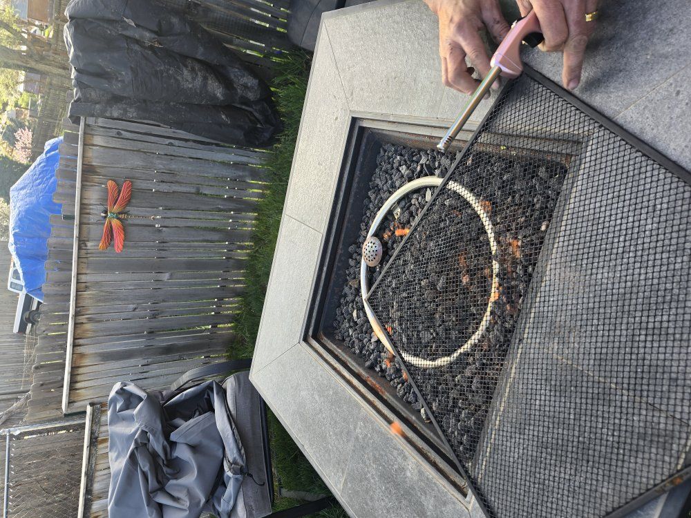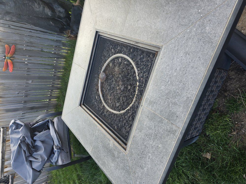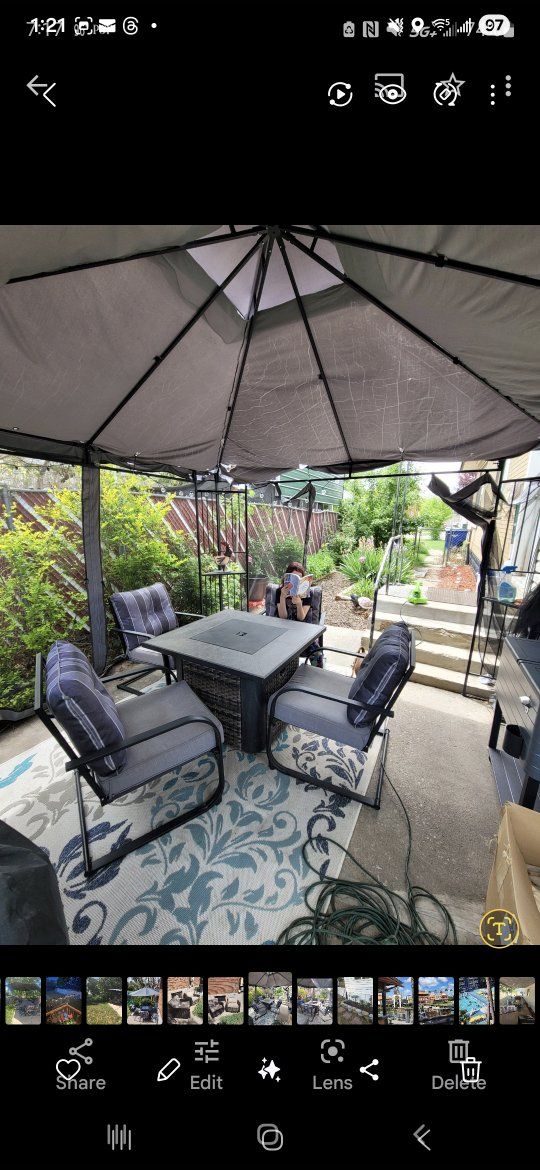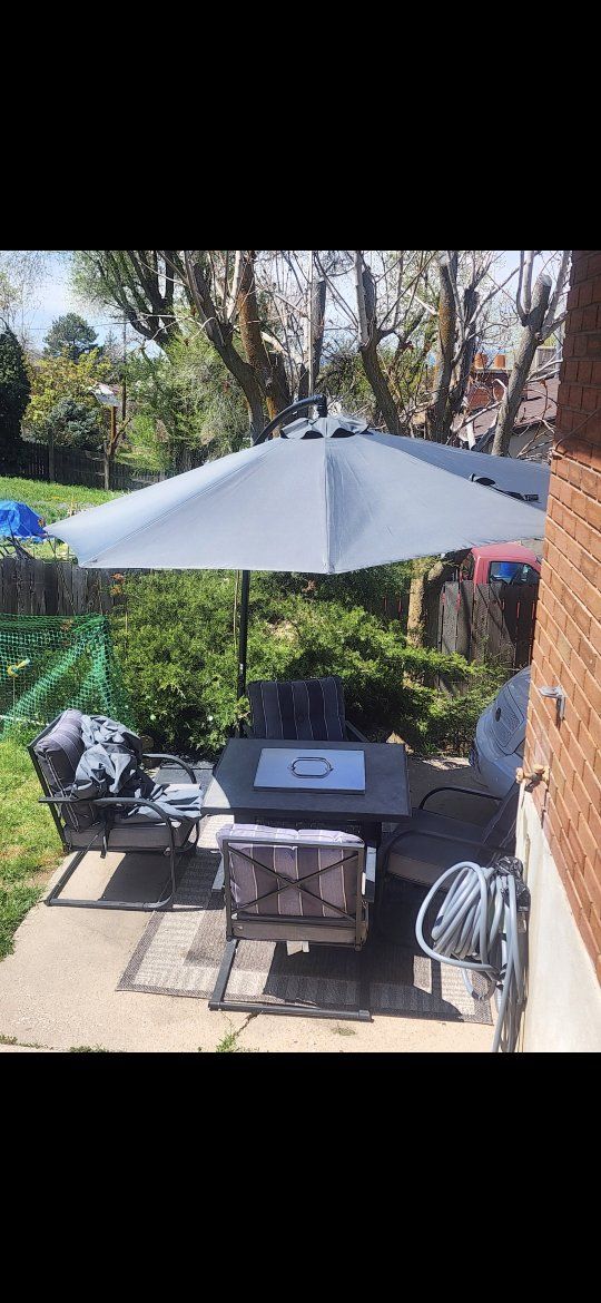 Venmoused but in good shape 4 chairs and firepit, propane tank not included, i keep it covered and I keep it clean, everything is in good shape has all cushions no rips or tears, bought a new cover because the original got lost while moving one corner just needs to be tightened and I don't know how to do it. umbrella is not included in price if you want it make me an offer