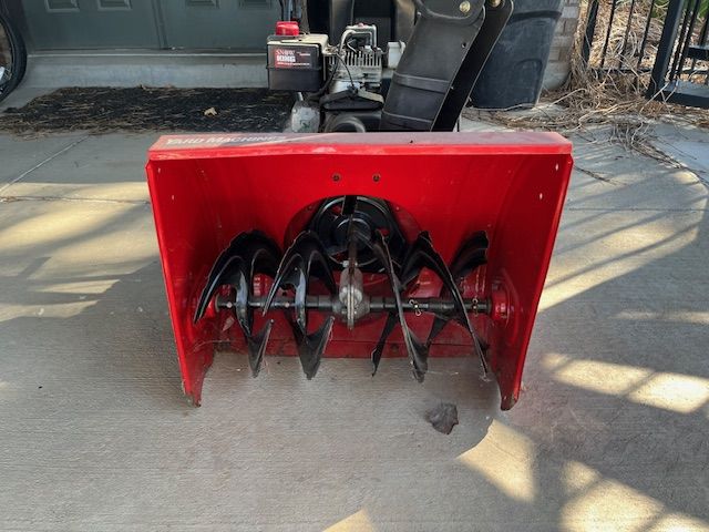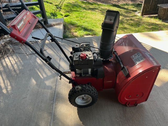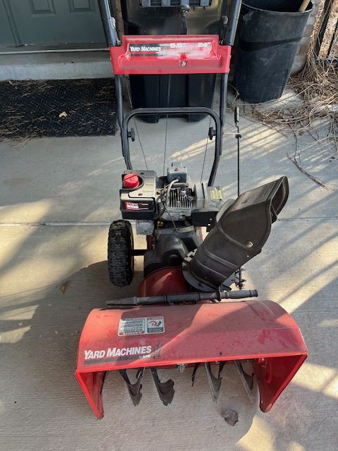 MTD Yard Machines snowblower. 5.5 Hp, 24". Has electric start. Runs but needs the pull cord rewound and the fuel liine has a leak and needs to be replaced.