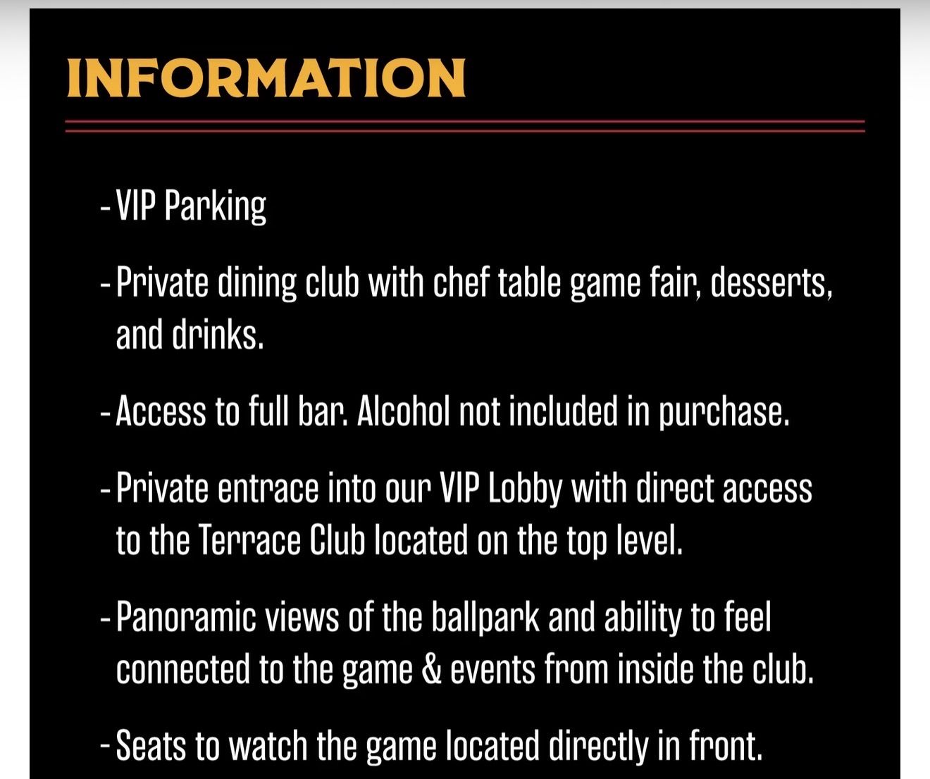 Front row (unreal view) Food + Drinks INCLUDED (Alcohol not included) Private club, no lines Premium Parking Pass (2 included)