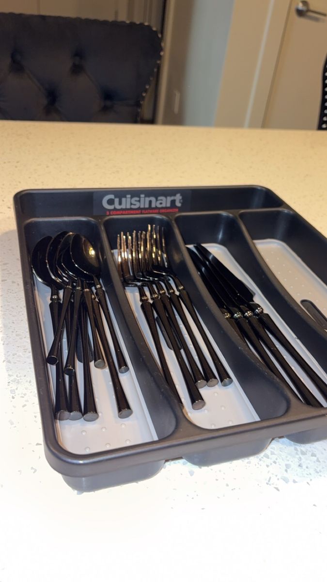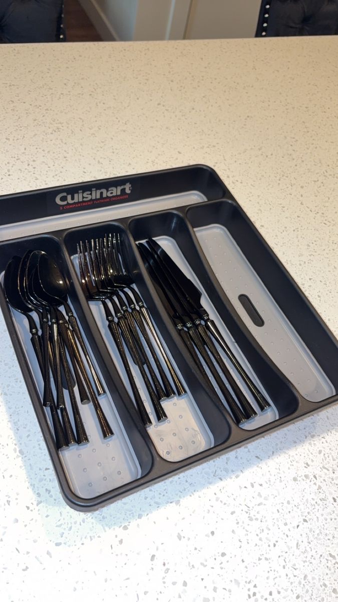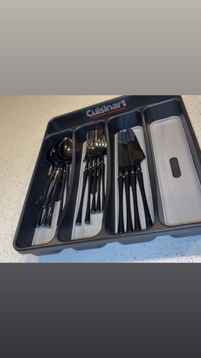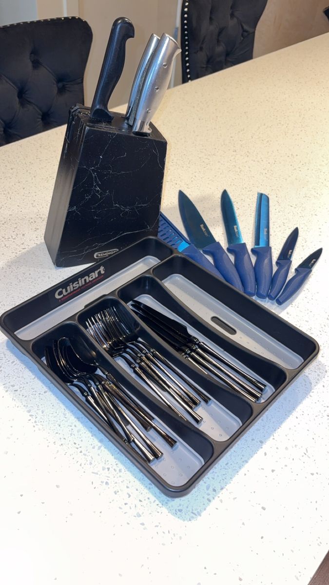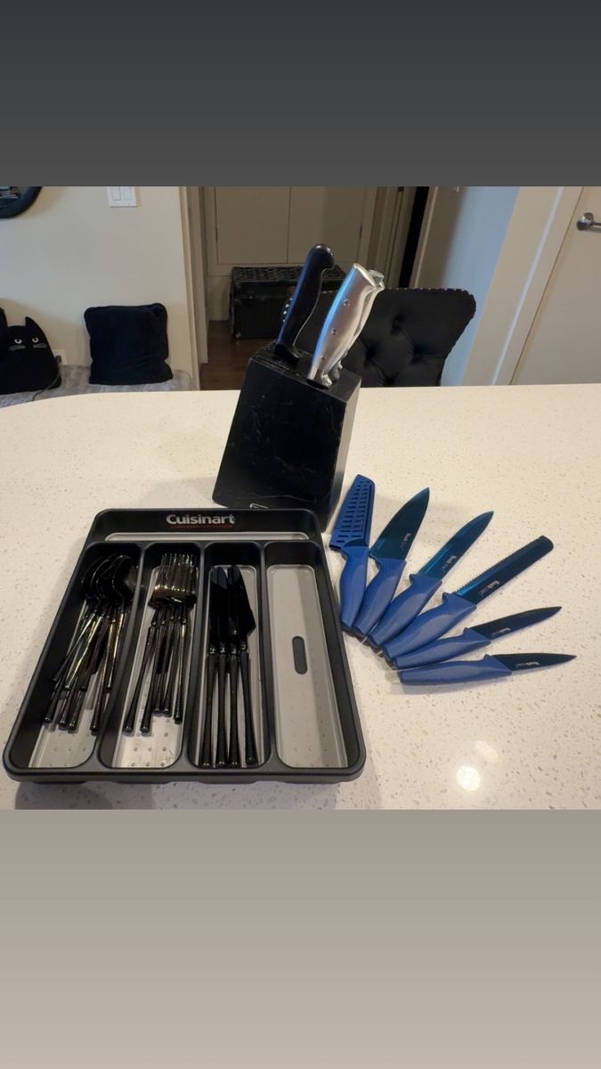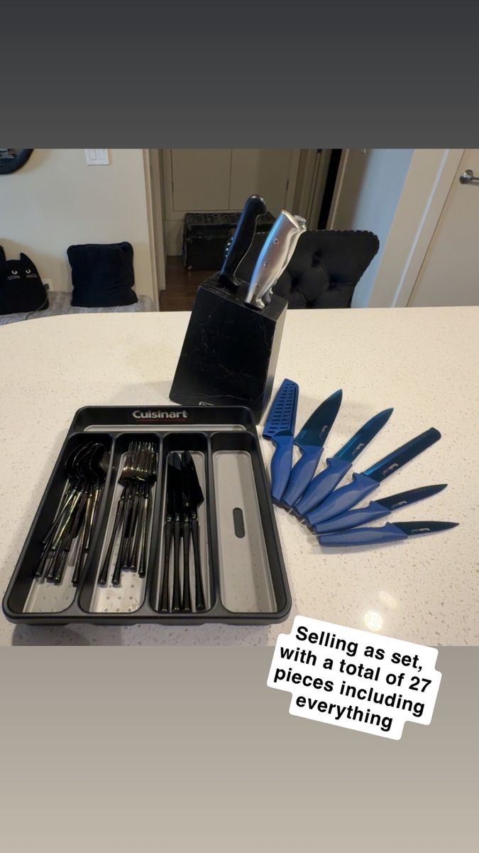 VenmoIncludes: -1 Cuisinart silverware organizer (has five organizing slots) -1 Black wood/marble design knife block + sharper (holds five knives) -One full set of shiny black silverware (4 small spoons, 4 big/regular-sized dinner spoons, 4 knives/butter-knives that’re lowkey sharp for butter knives lol, 3 small forks, and 2 big/regular-sized dinner forks. Making it a 17-piece silverware set) -A freshly-sharpened 10 piece knife set (that has been sanitized, and thoroughly washed as well) -Selling as a 27 total piece set