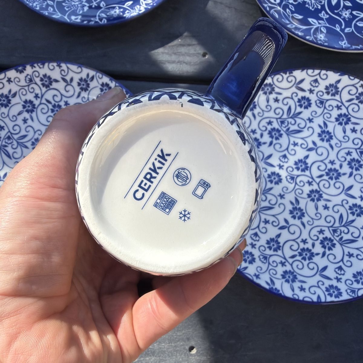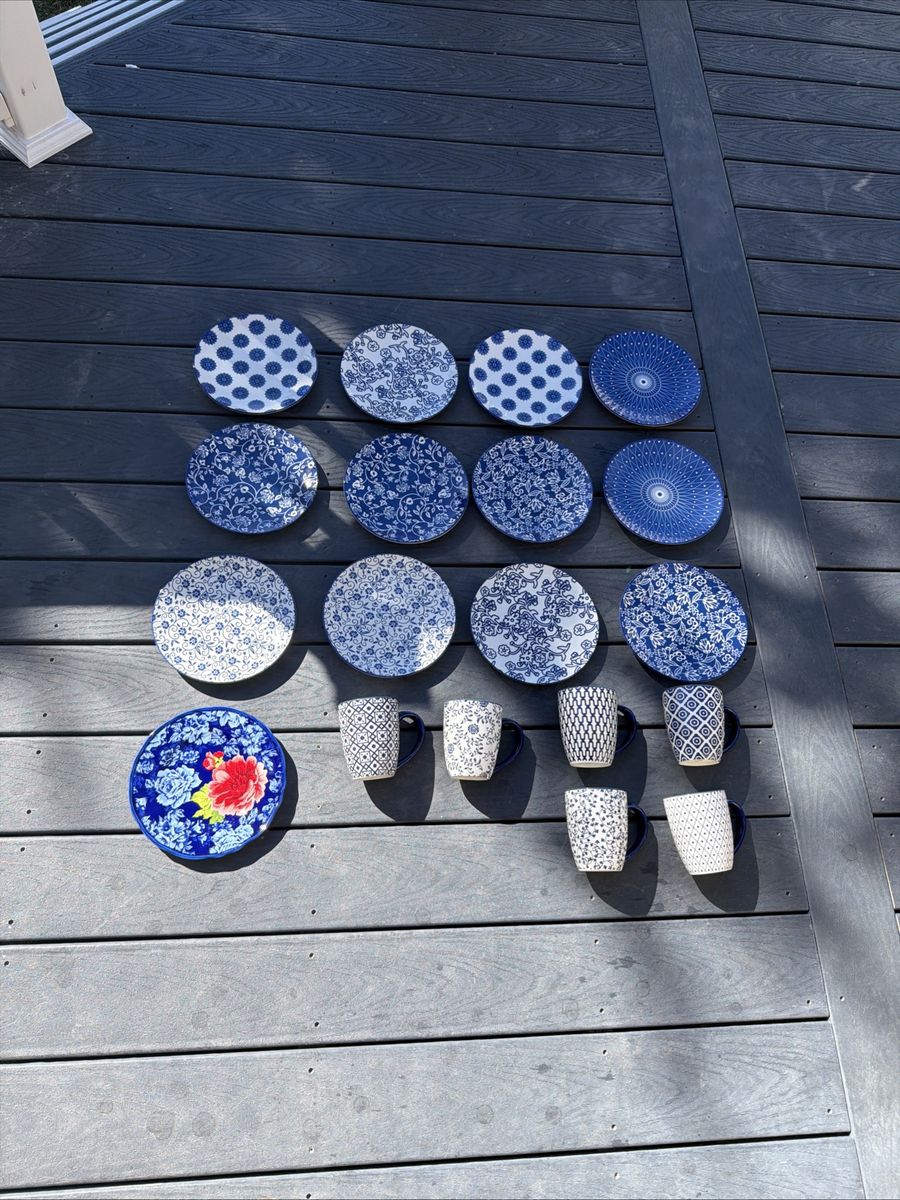 VenmoCerkik Porcelain Dinner Plates Set, Blue/White, Dishwasher Safe And Mugs NEW
