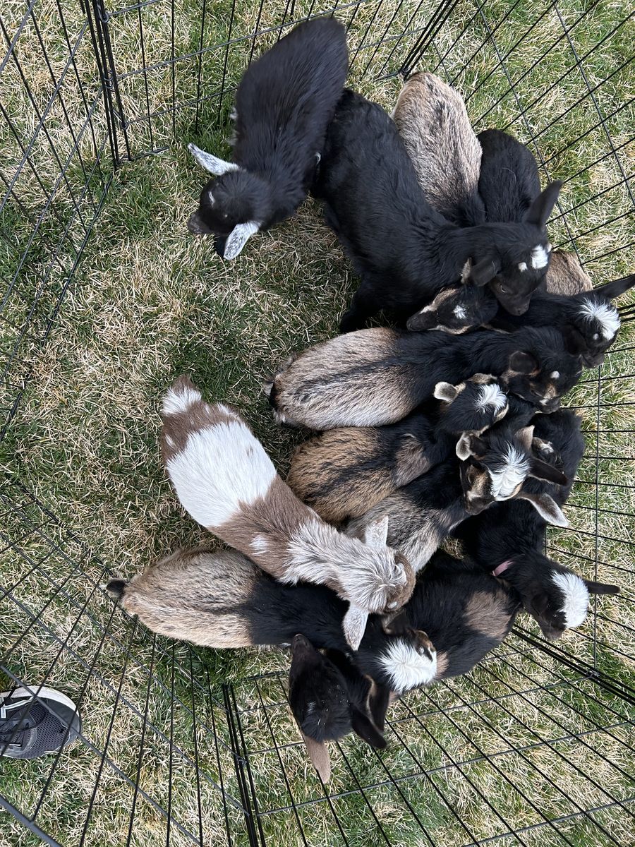 Venmo11 kids (baby goats) ready for new homes First come gets first choice. I will only hold with money down. I will consider discounts for buying more than one. This is what I have. I pretty sure in order of the way they are pictured. 3 that are 3/4 Nigerian Dwarf 1/4 Pygmy (1 males 2 female) 8 weeks old 2 that are full Nigerian Dwarf both are males 8 weeks old 3 that are 1/2 Nigerian Dwarf 1/2 Pygmy (1 male 2 females) 7.5 weeks old 1 that is 1/2 Nigerian Dwarf 1/2 Oberhasli (male) 5.5 weeks old And 2 that are 1/2 Nigerian Dwarf 1/2 Pygmy ( both males) 5.5 weeks old.