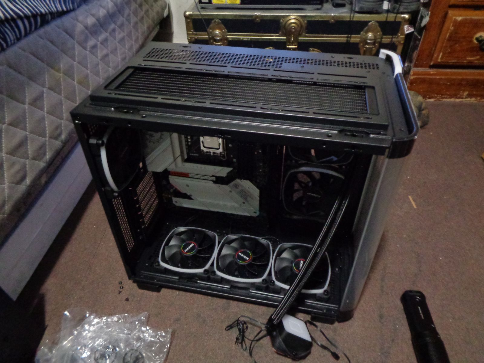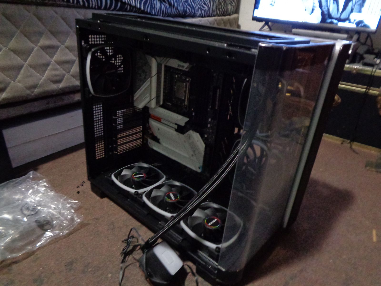 The Rest of the Case screws and accessories including the extra mesh front panel. The rest of the PSU cables, accessories and the box. The Motherboard box With the WIFI cable/antenna The USB drive that came with the motherboard with its drivers on it The AIO box with remaining accessories Including the remaining Be Quiet custom Plastic overlays that go over the pump housing ARGB area.