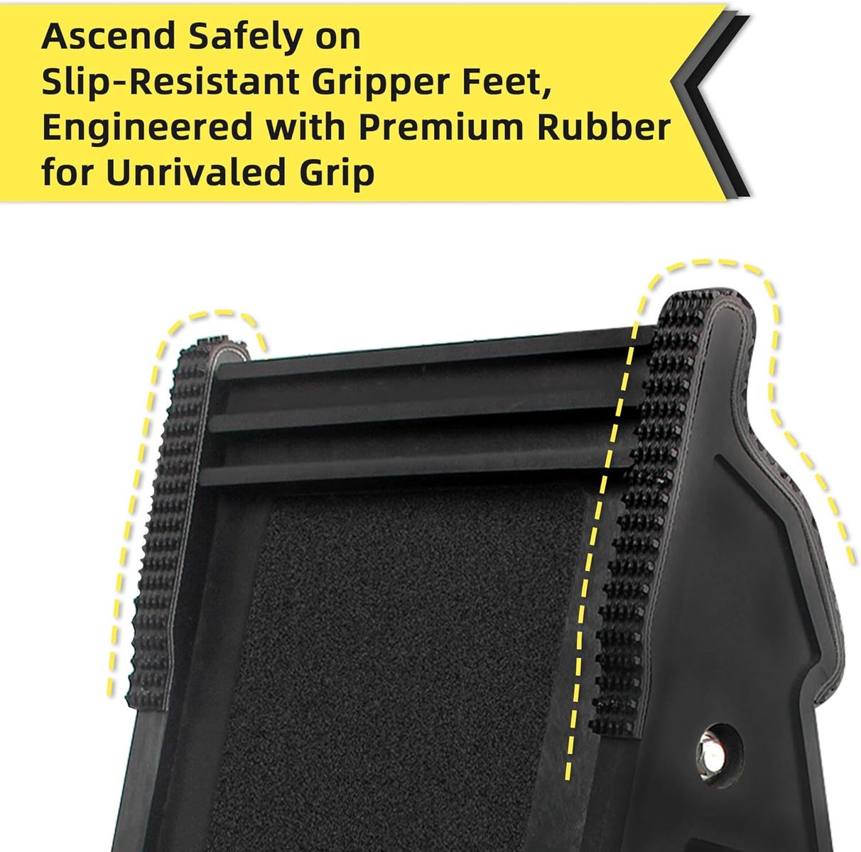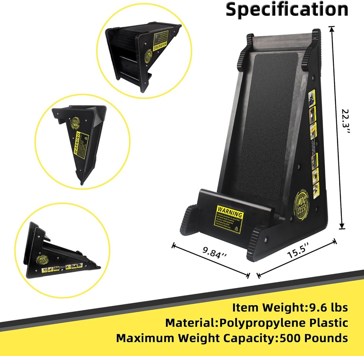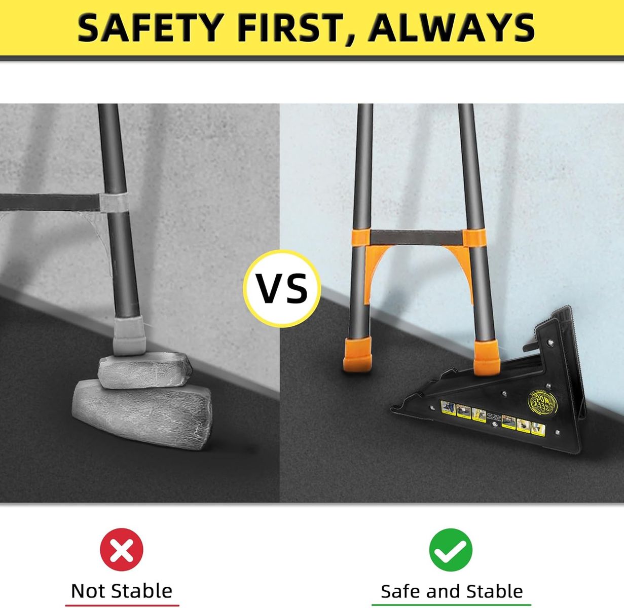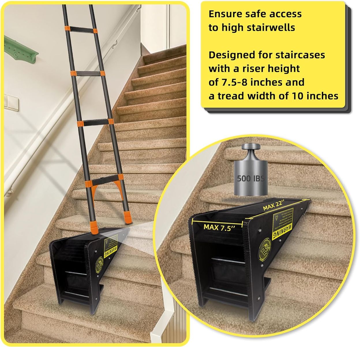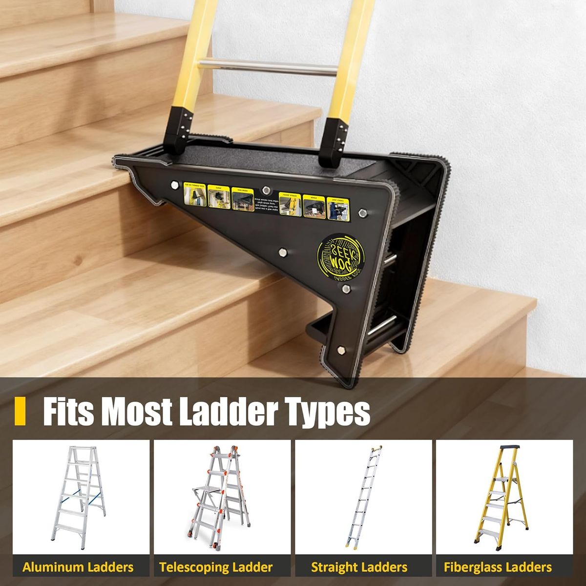 Safety and Stability - Ladder stabilizer boasts a special scientific triangle design, enhancing stability when using stairs. The stair ladder provide robust support, with non-slip surfaces that automatically lock in place on stairs. The back cross brace structure reinforces fundamental support up to an impressive 500 lbs, far surpassing the ladder’s 300lb, 1A duty rating.