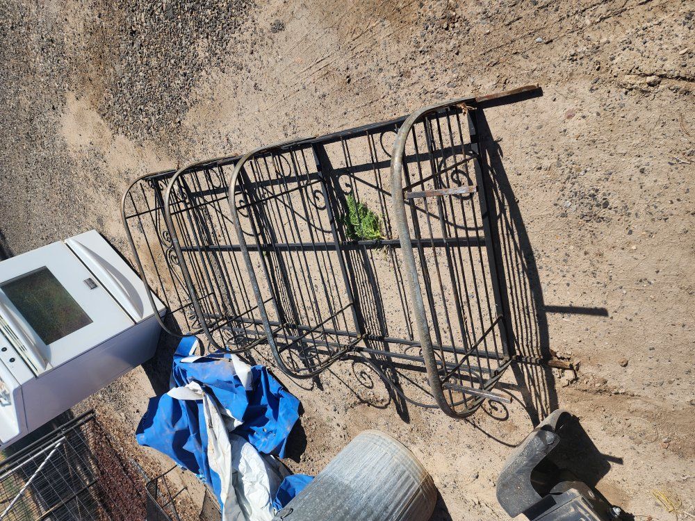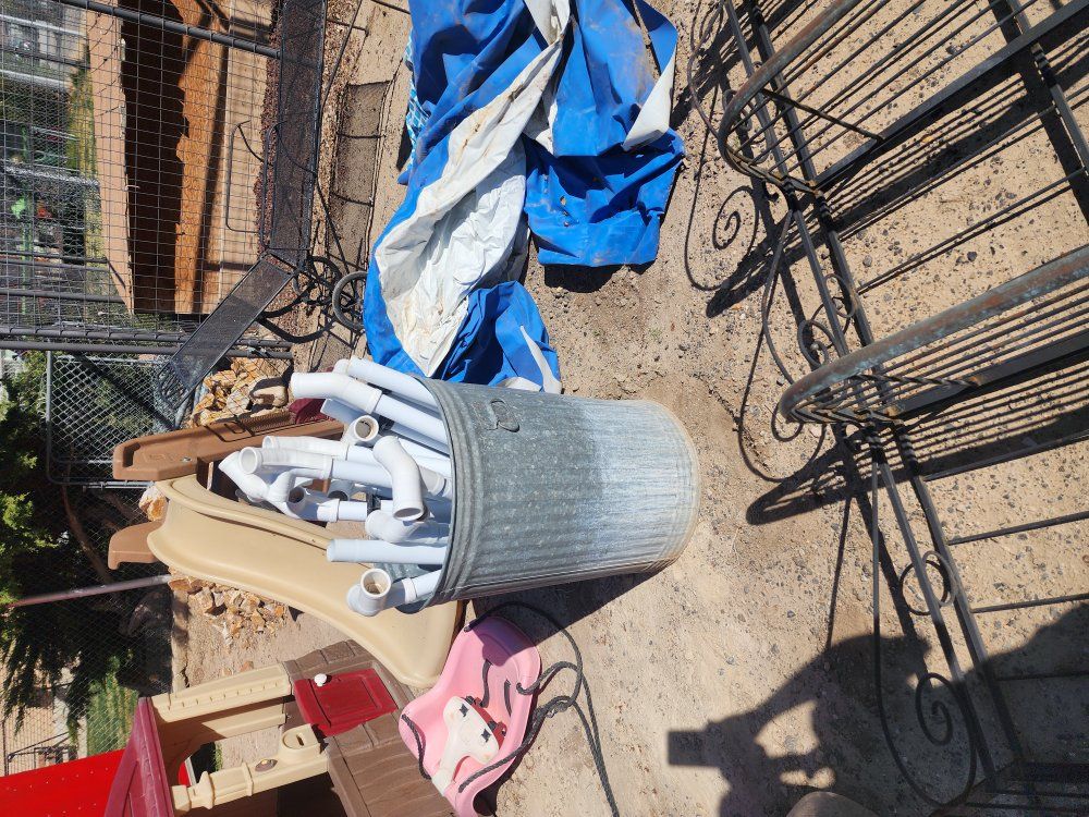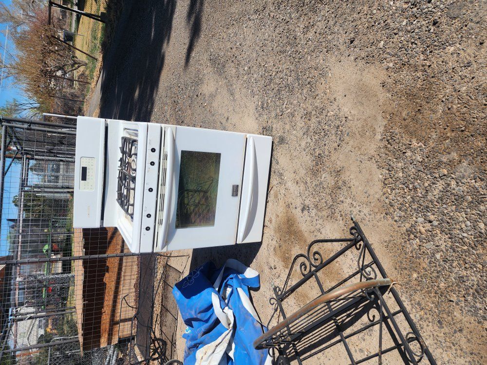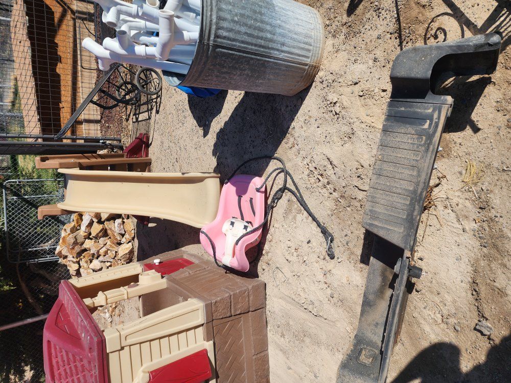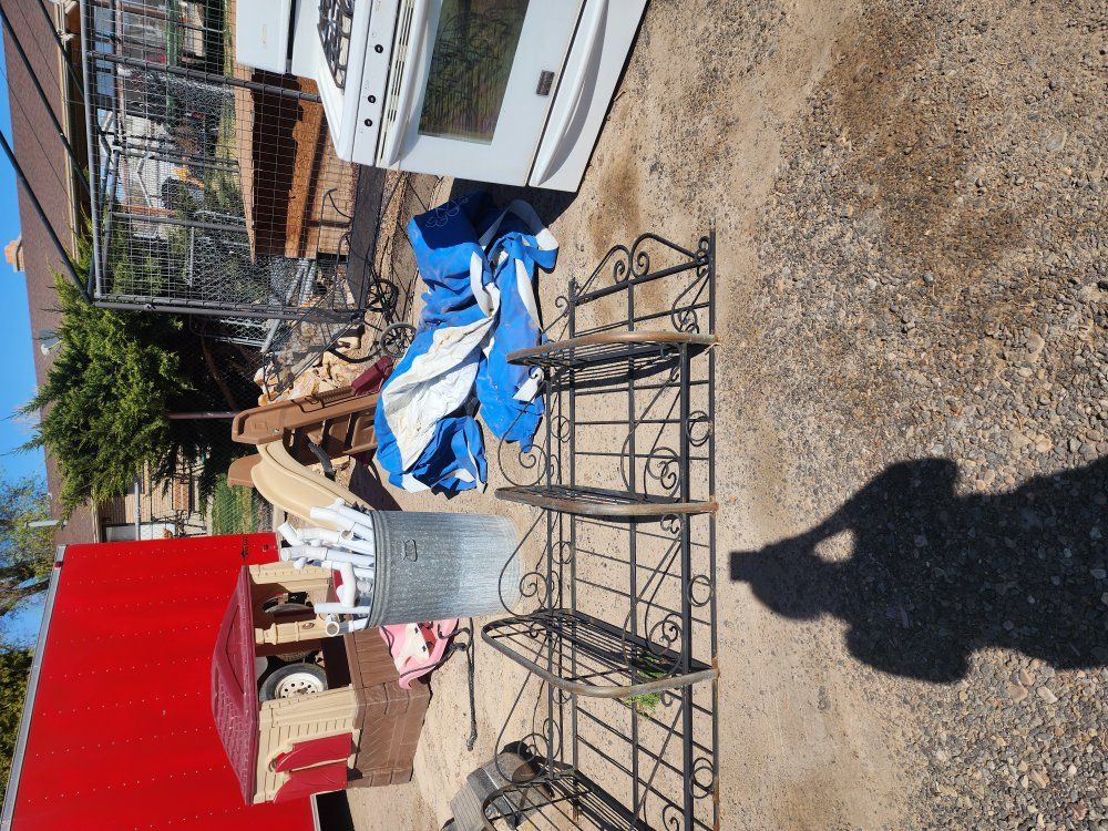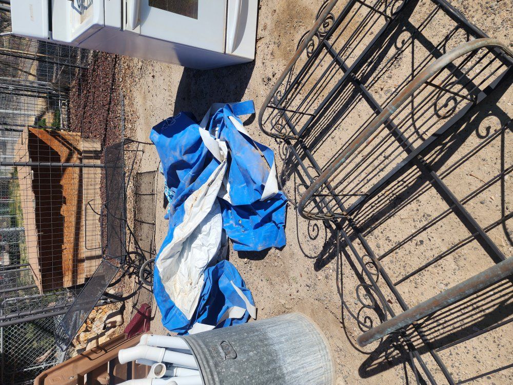 Plastic playhouse and slide, chaise metal patio chair, gas stove works, metal shelf, trampoline frame, 12 foot pool with cover and pump works need small patch. ALL FREE spring cleaning