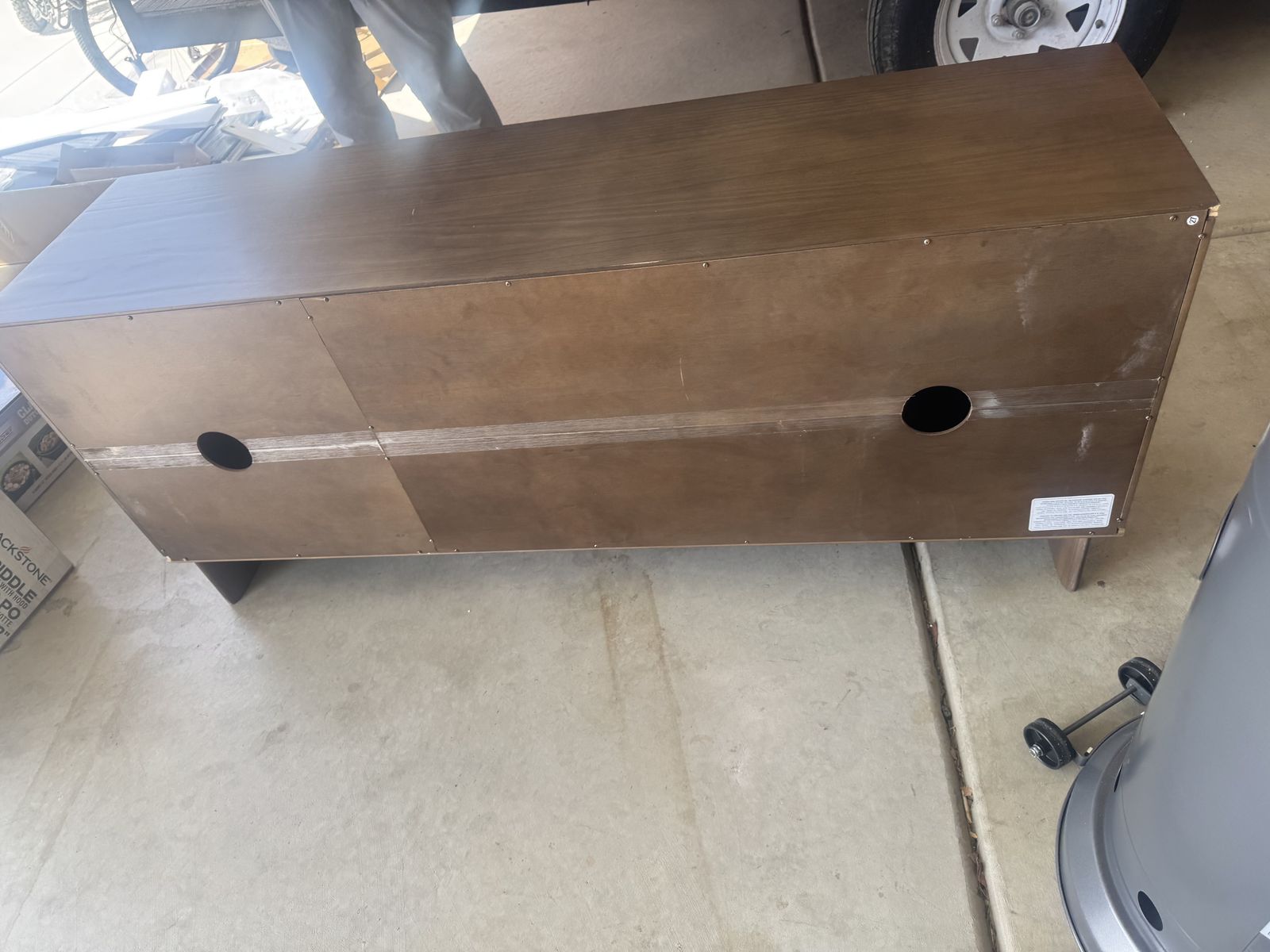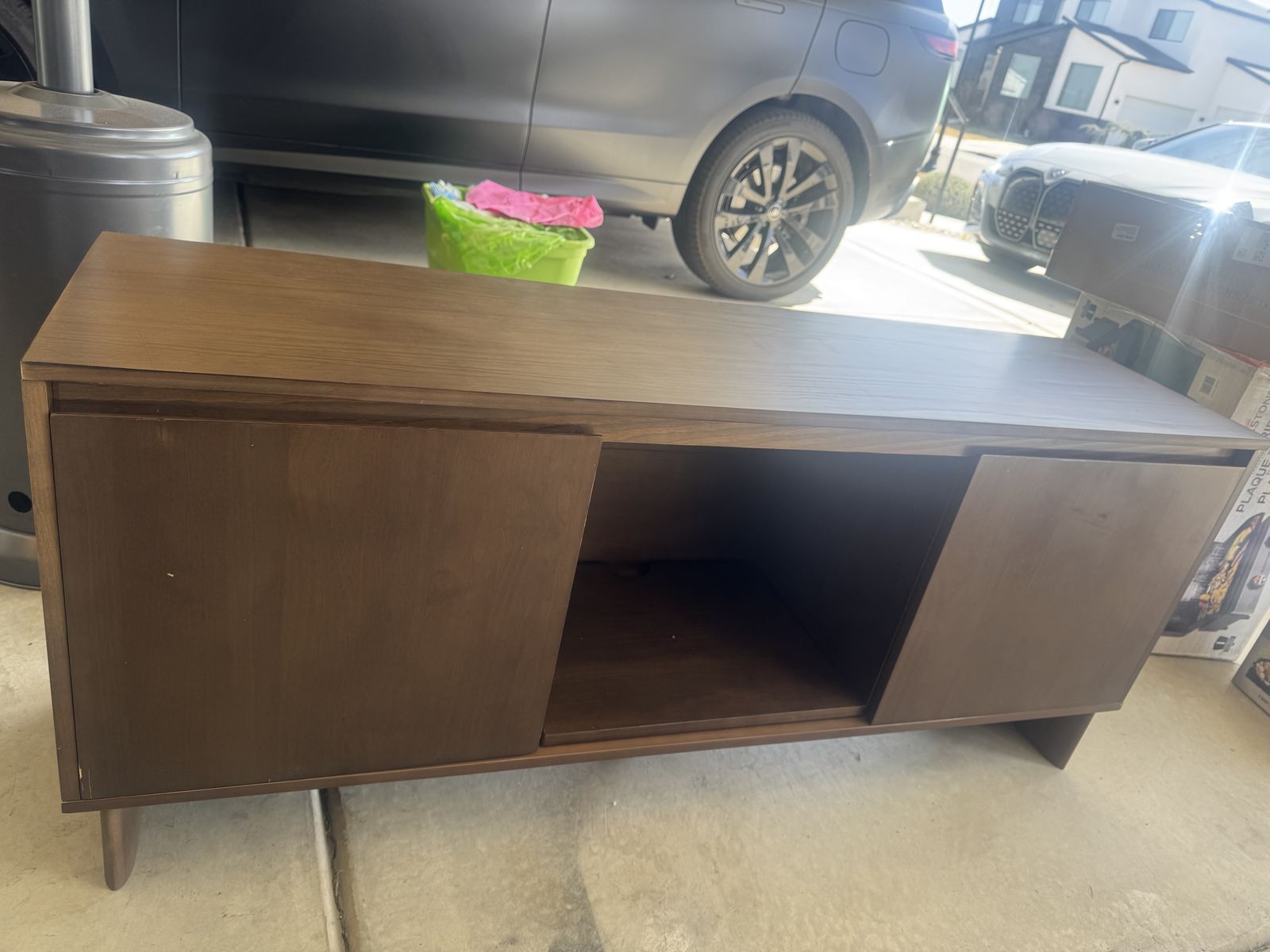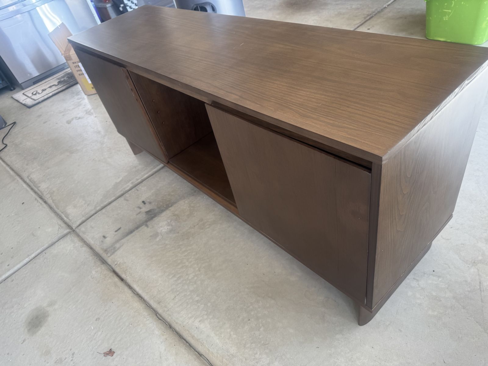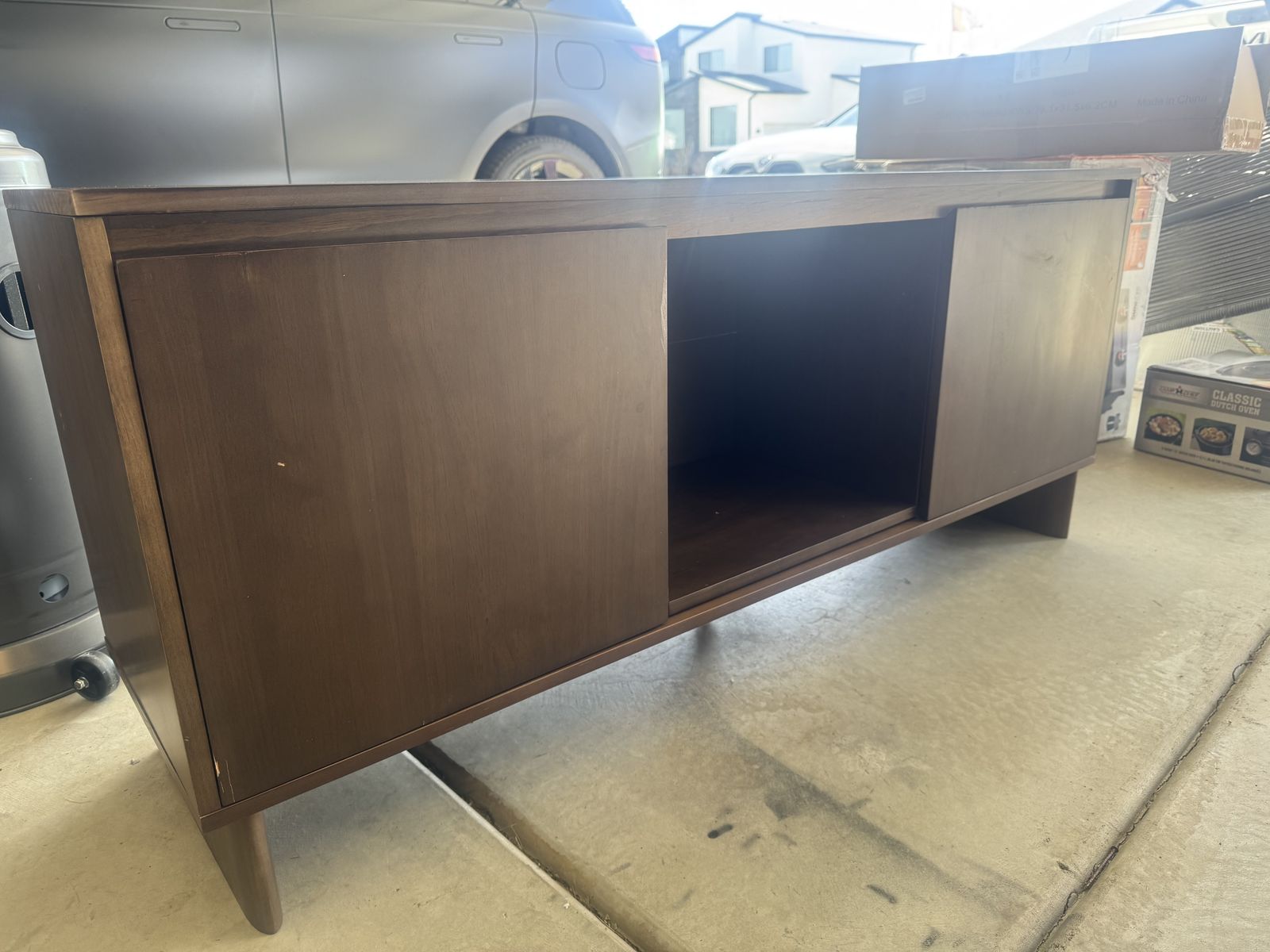 Beautiful modern solid wood TV stand in walnut finish, perfect for contemporary living spaces. A few minor surface scratches from shipping (barely noticeable).