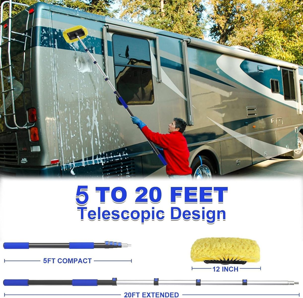 ApplePayBuyplus 26FT Reach Car Wash Brush with Long Handle, 12-Inch Soft Bristle Head, Truck Wash Brush with 5-20FT Telescoping Pole, Car Washing Brush for Cleaning Car, SUV, RV, Boats, Solar Panels Blue