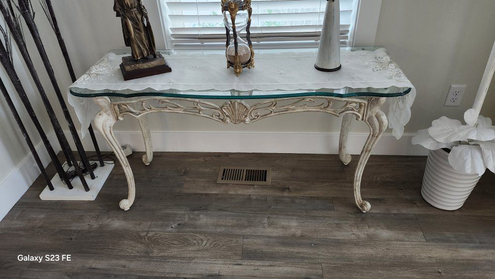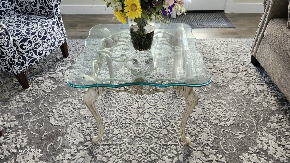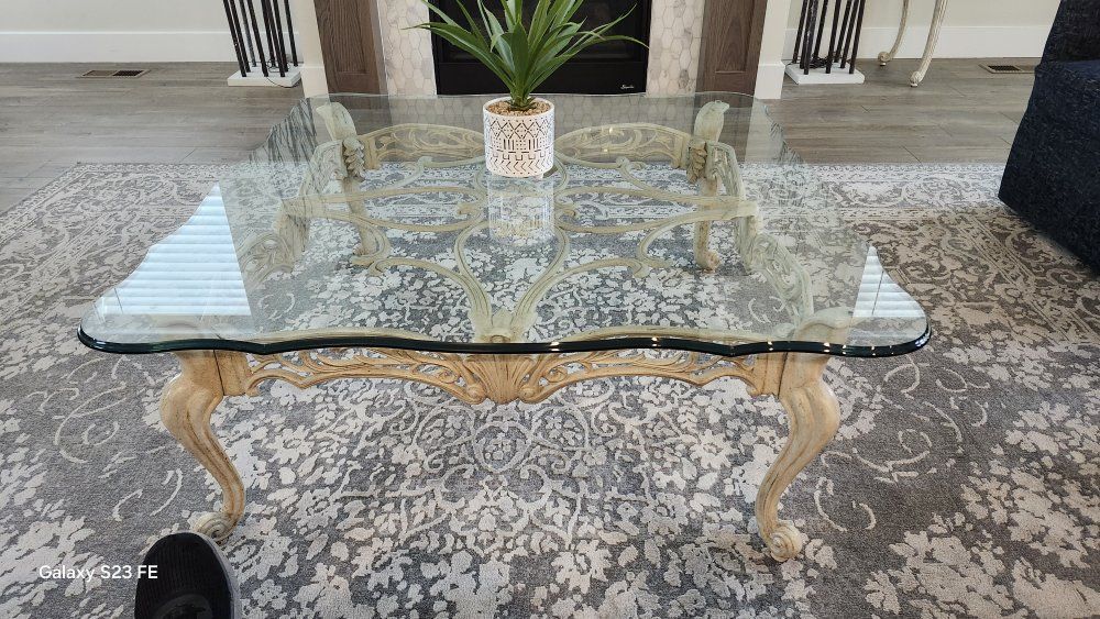 matching tables (4) - dining, coffee, end, and side tables. Antique (Italian)? look with heavy beveled glass tops. 6 highback cushioned chairs.