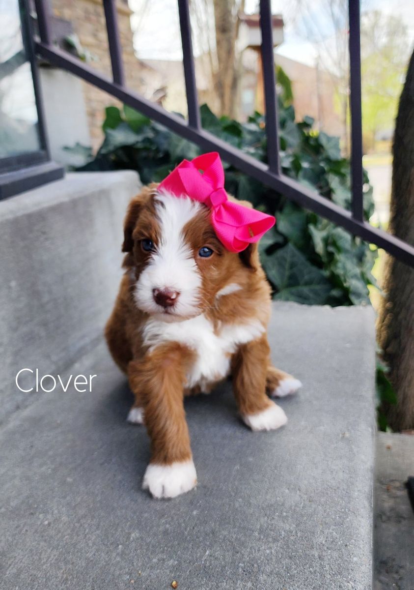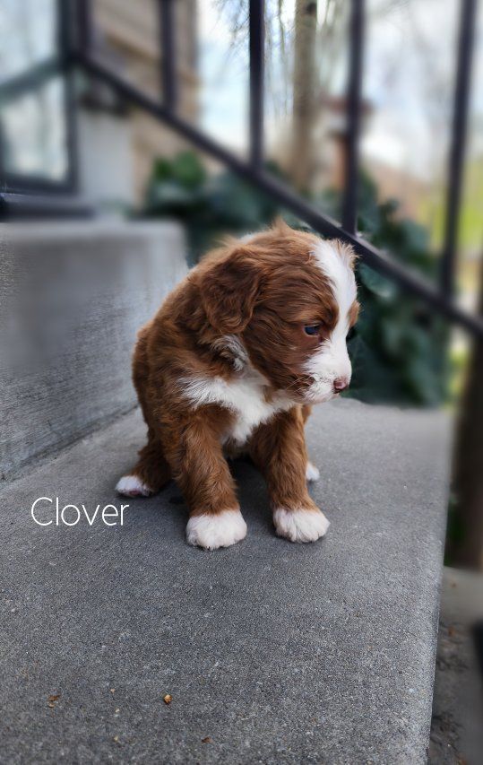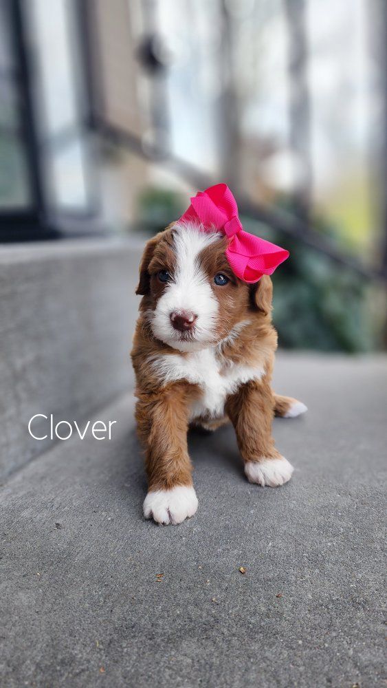 ZelleMeet Clover 🤍 a Micro Mini Bernedoodle with a look that turns heads and a temperament that melts hearts. With her beautiful white abstract contrasting against deep red and soft, ️wavy️ coat, she offers that low to non-shedding quality many families are looking for allergy considerations—paired with an easy, manageable texture. Clover is expected to mature to between 10–18 pounds, making her the perfect “take anywhere” companion. Small enough for travel and everyday convenience, yet sturdy enough to keep up with an active lifestyle. Raised right in our home with intention and care, Clover is being started on proven protocols that focus on temperament development, early socialization, and foundational training. She’s growing into a people-loving little gal who will transition smoothly into family life. If you’re looking for a well-rounded, thoughtfully raised Bernedoodle in a perfectly portable size, Clover may be just the pup for you🤍 ️Delivery available- Flight or ground ️3 year Genetic Health Guarantee ️Go home date April 15th! Please follow us, ️Salty Paws Doodles️, on social media for updates, available puppies, and a behind-the-scenes look at how we raise our puppies.