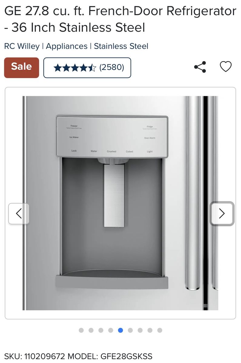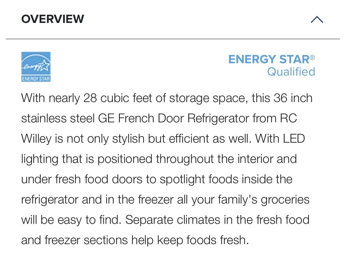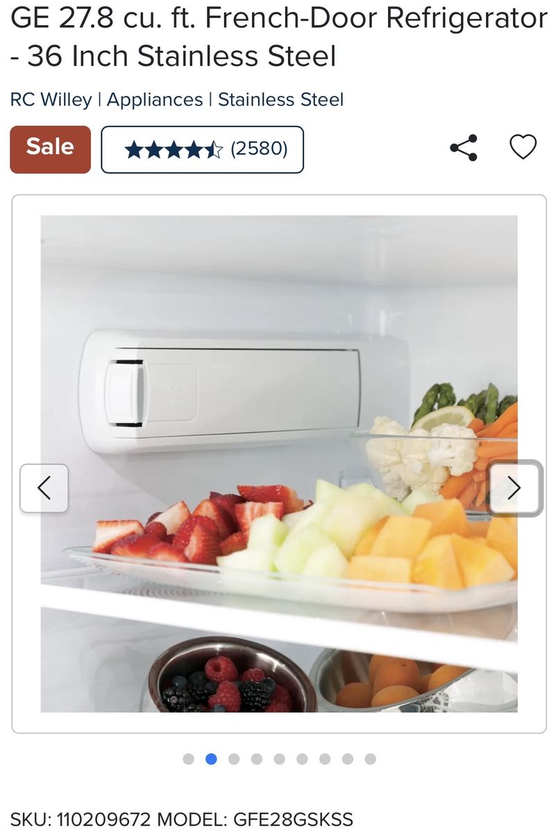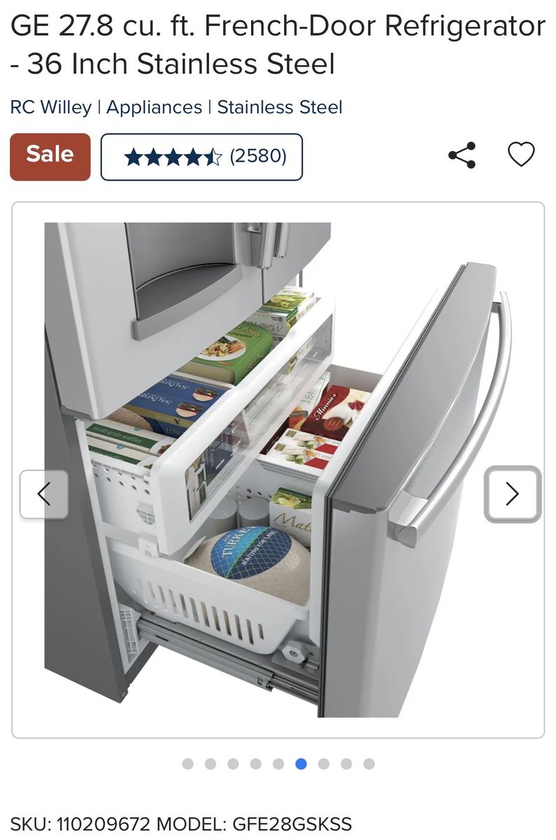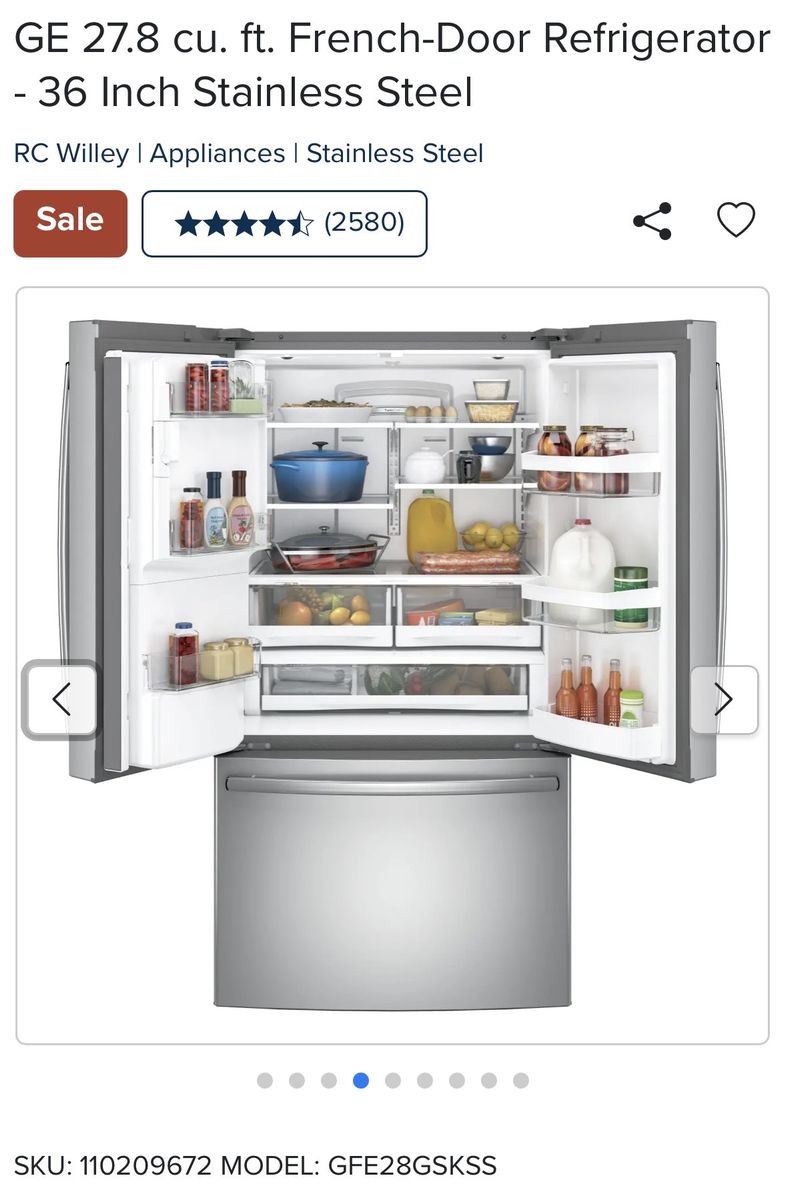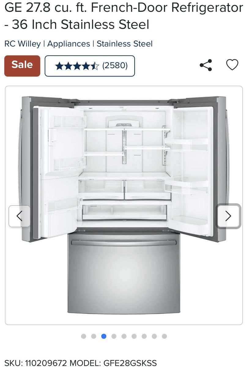 With nearly 28 cubic feet of storage space, this 36 inch stainless steel GE French Door Refrigerator from RC Willey is not only stylish but efficient as well. With LED lighting that is positioned throughout the interior and under fresh food doors to spotlight foods inside the refrigerator and in the freezer all your family's groceries will be easy to find. Separate climates in the fresh food and freezer sections help keep foods fresh.