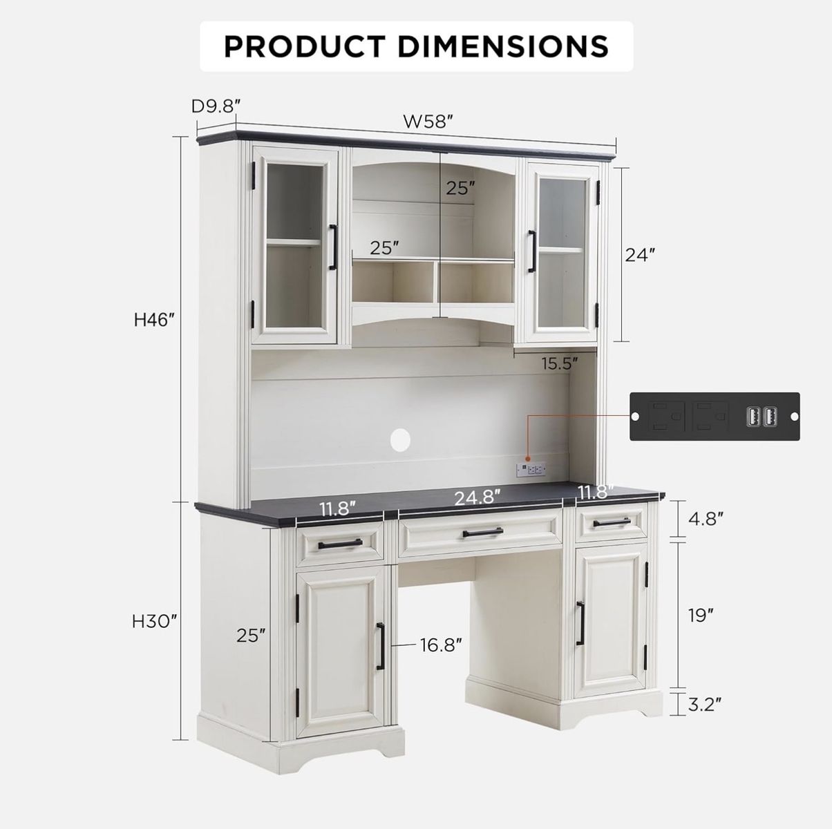 This sleek farmhouse executive desk with hutch is the perfect addition to any home office desk setup. It offers a spacious desktop and ample storage space, allowing for an organized and comfortable work environment. Its large size and versatility make it ideal for those seeking a high-quality, stylish desk for their home office. Measuring 58 "wide 76" height, this spacious executive desk provides ample space for files, computers, printers. It features 3 sliding drawers, 2 storage cabinets, 7 different cubbies which can accommodate a large number of files, books, and other office essentials, making it an ideal choice for those in need of a practical and stylish Home Office Desk. This desk is not only a functional workstation, but also a stylish piece of furniture that will elevate the aesthetic of your space. With its spacious surfaces and ample storage, it's perfect for professionals, work-from-home individuals and students alike. Charge On-The-Go: The built-in charging ports offer added convenience, allowing you to easily connect and charge various electronic devices while learning or working at the table.