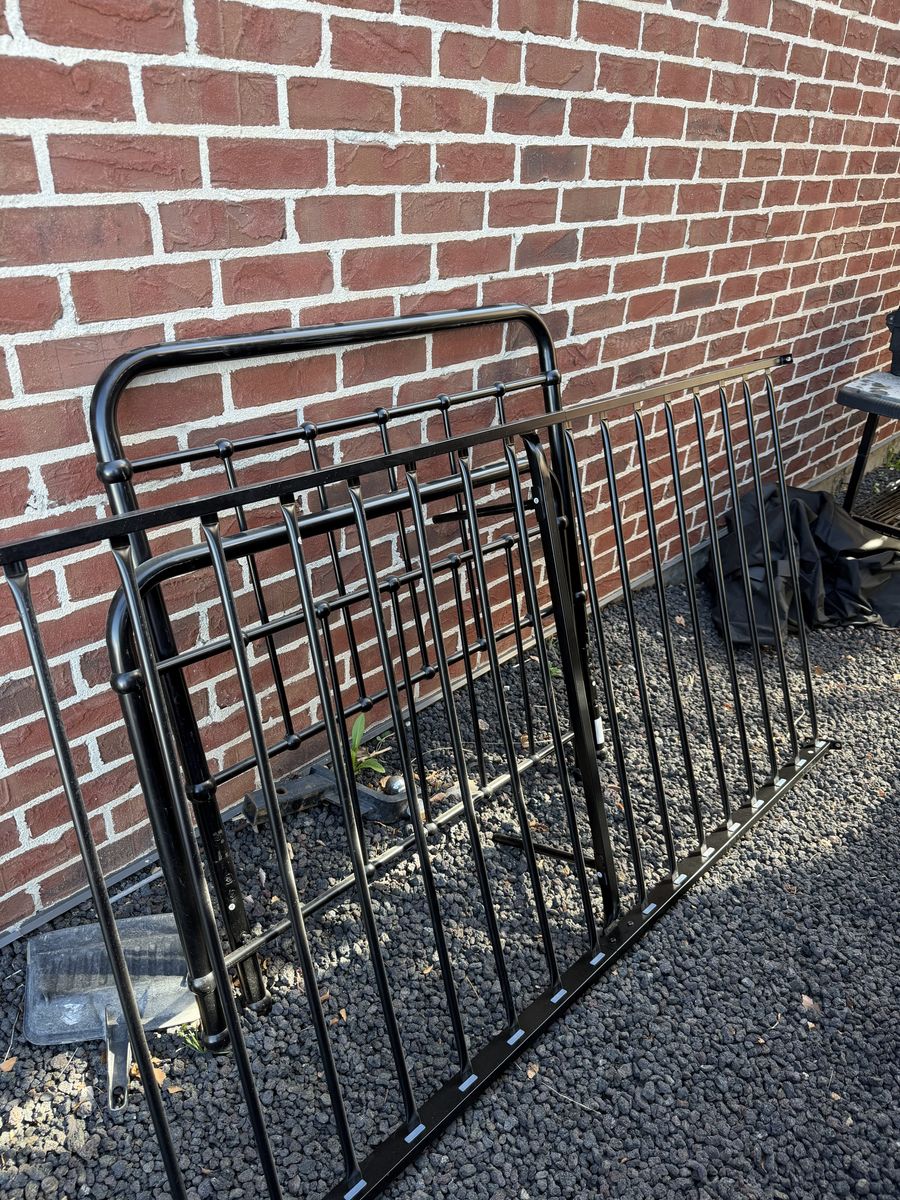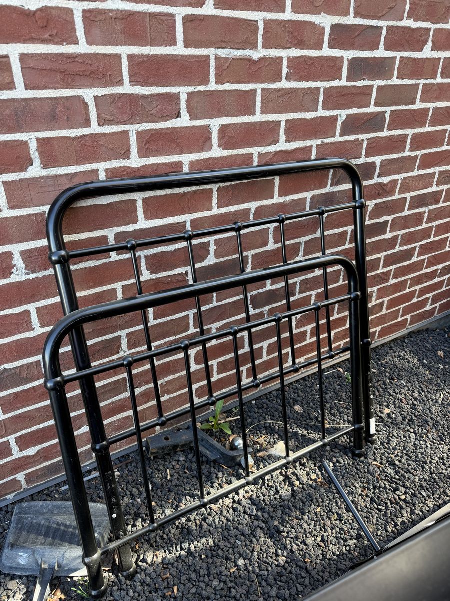 • Color: Black • Size: Twin • Includes headboard & footboard • Metal slat/support pieces included • No box springs needed • Good condition – no major damage • Smoke-free home