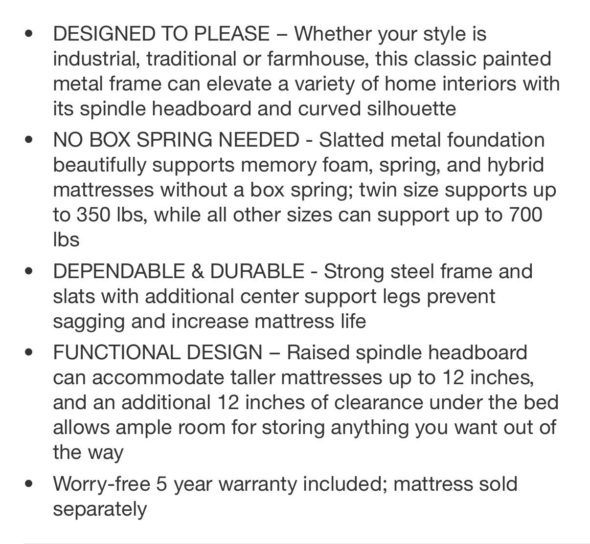 Sturdy black metal twin bed frame with headboard and footboard included. Clean, modern style and very solid. Easy to assemble and fits standard twin mattress.