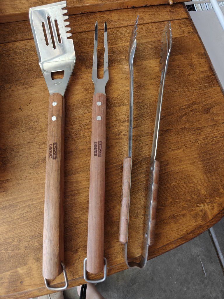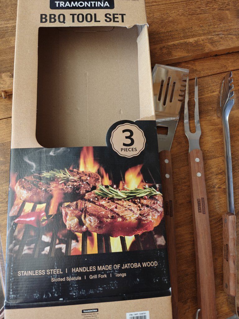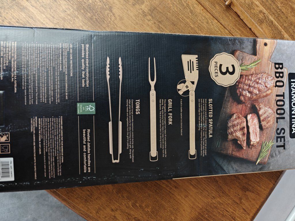 Tramontina BBQ Tool Set 3 Piece Stainless Steel Grill Fork Tongs Spatula , The box is open and slightly torn, but the items themselves are new and unused. Cash only
