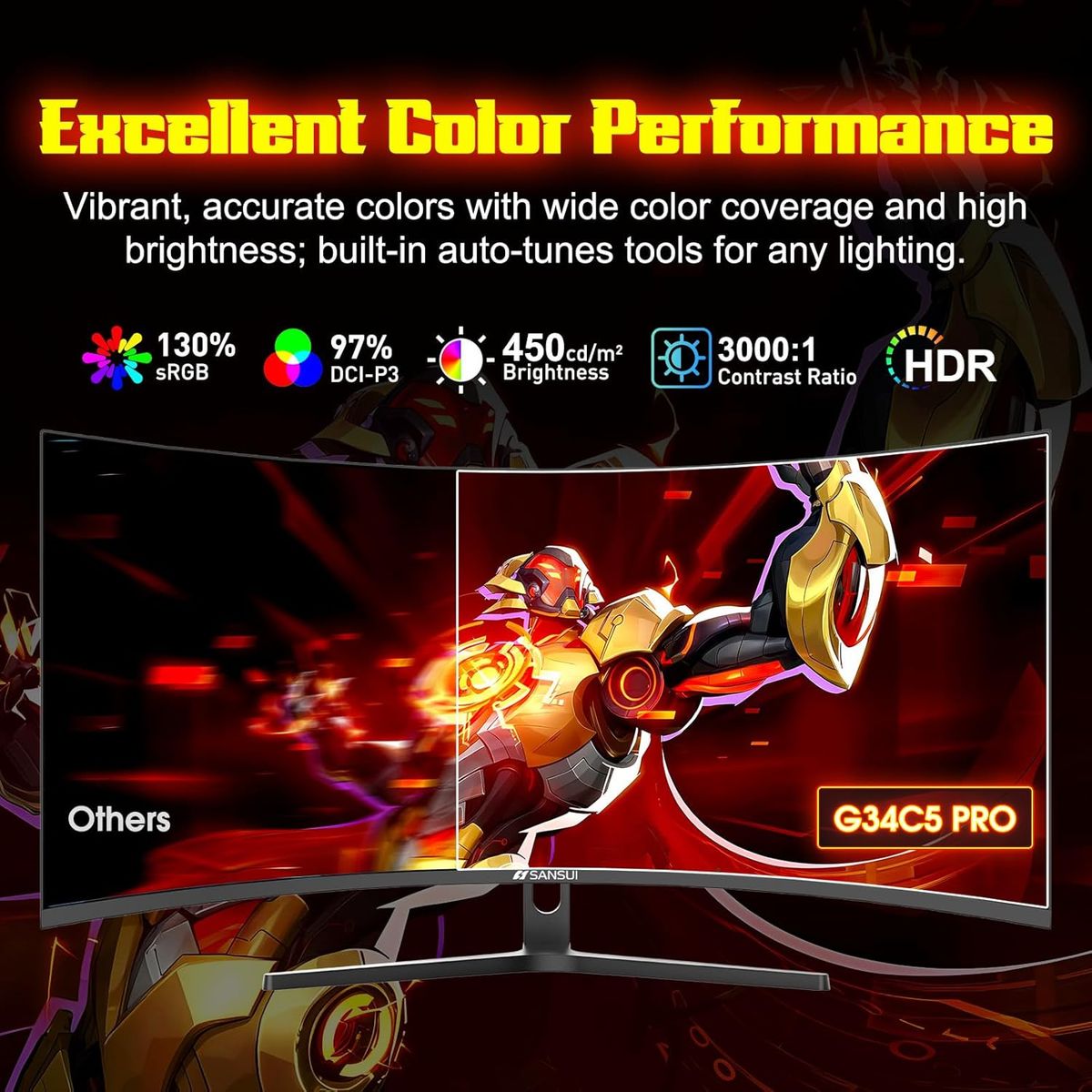 ApplePaySANSUI 34 Inch 240Hz Ultrawide Curved Gaming Monitor UWQHD 3440×1440, 21:9 2K Curved Monitor 1500R,HDR400,Fast VA, PIP/PBP,AI Crosshair,AIPQ(Visual Enhance),MPRT 1ms,HDMI2.1 2,DP1.4 2